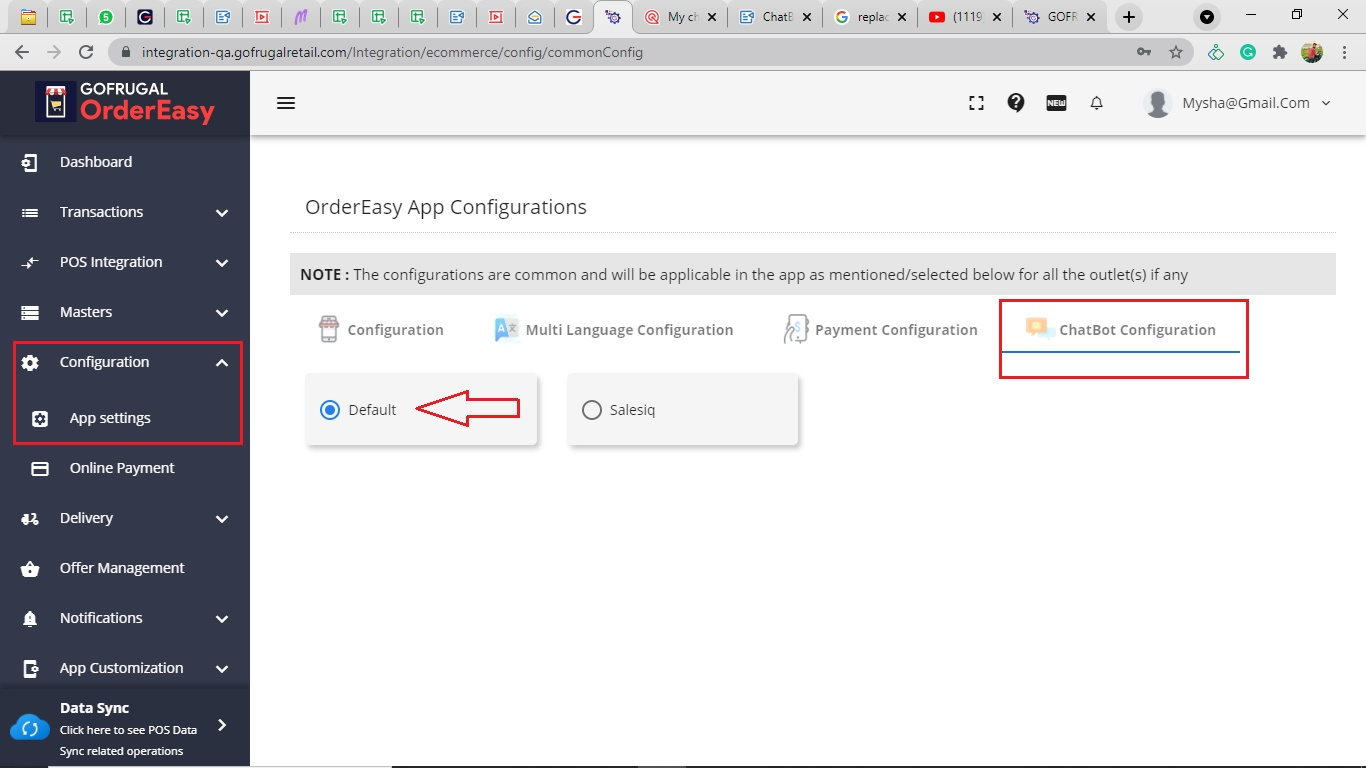 Login to integration.gofrugal.com with admin credentials. Go to Configurations>App settings>ChatBot Integration and select "default".