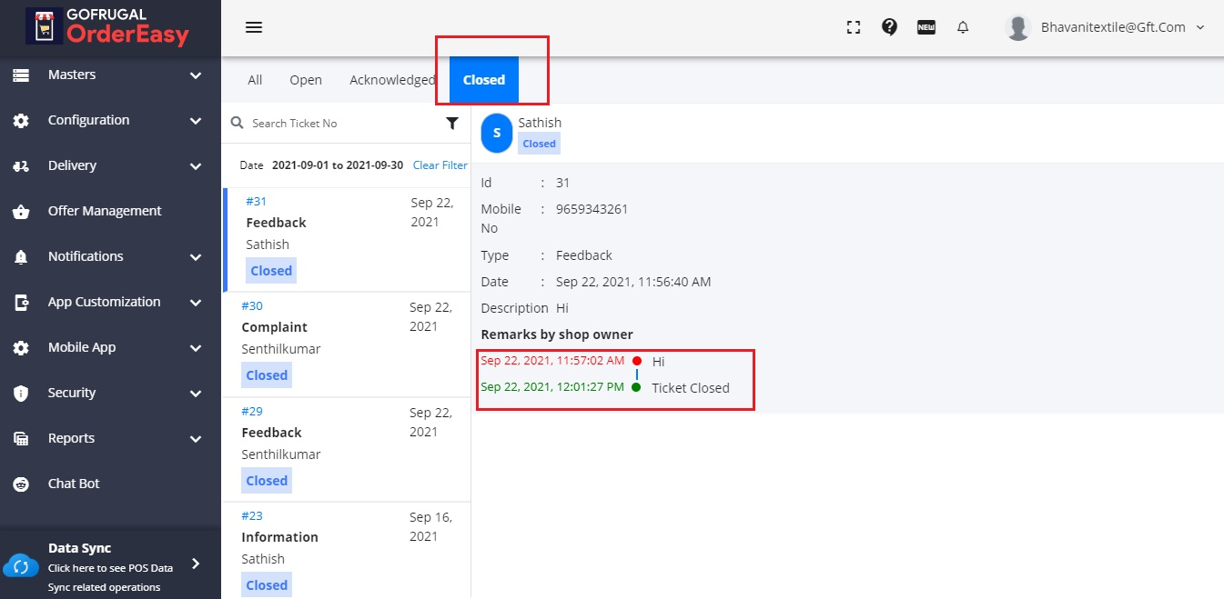 To allow the consumers to share their complaints, feedback, or to know any information, a Ticket chatbot was introduced where consumers will be raising tickets for which you can share your remarks or update the status for the tickets. Remarks/status will be notified to the consumers. It helps the consumers to track their ticket status from their OrderEasy app itself.