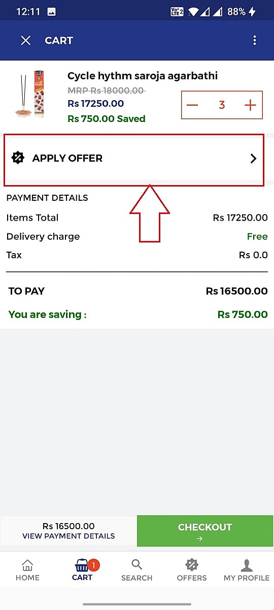 Once the offers are set up in the portal your customers can view the offers in the " offers" tab in your branded mobile app and the same can be availed in the cart screen.