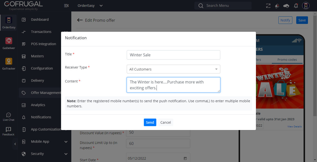 You can even send push notifications to a customer's app by using the "Notify" option. By clicking the notify option you can set a title and description and send the same to either all customers or specific customers by entering their mobile numbers as shown below in the images.