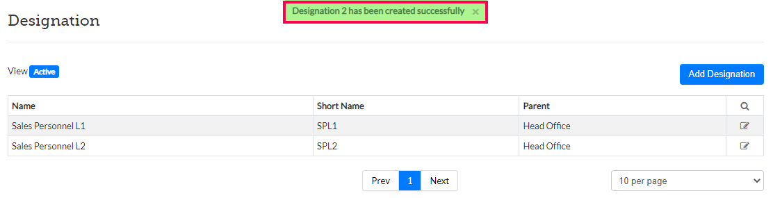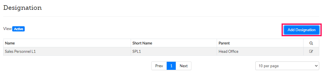 Step 3: On the Designation screen, click on Add Designation to add a new Designation. To edit an existing Designation, click on the edit icon to the right of the corresponding Designation.