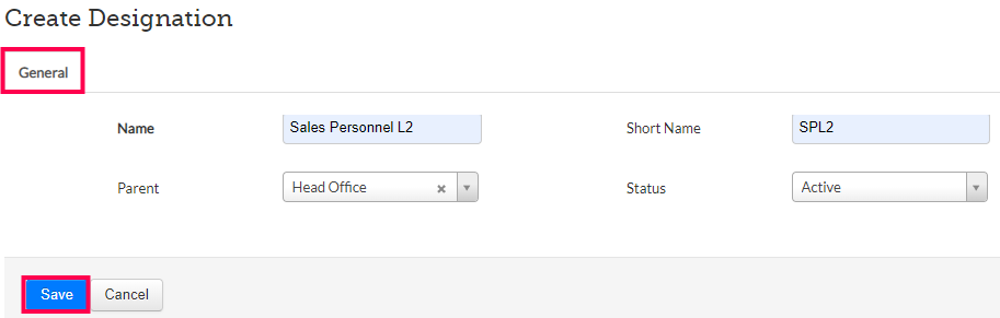 Step 4: On the General section of the Create Designation screen, fill in the fields and click on Save