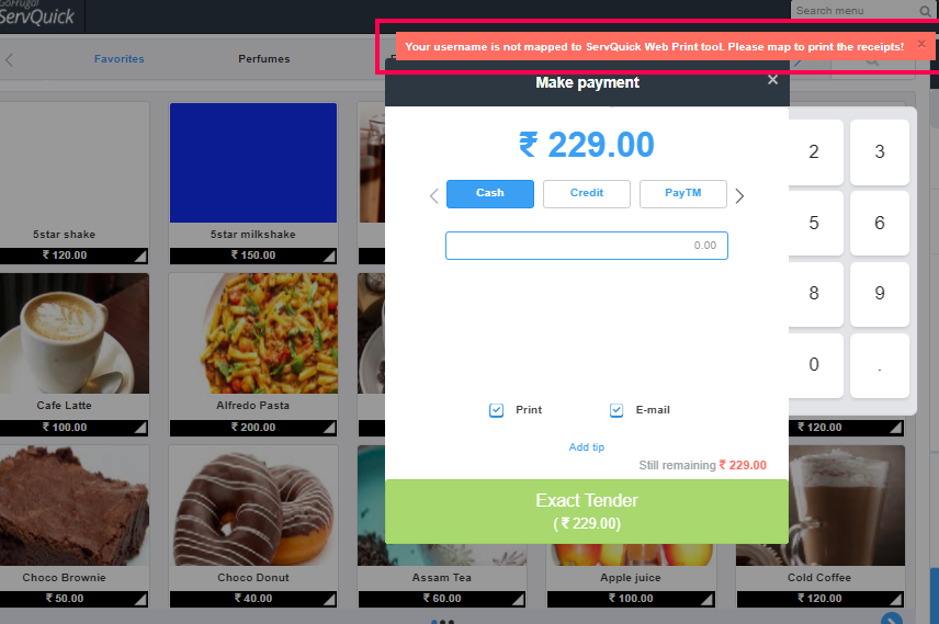 Note: The username should be mapped to ServQuick Web Print tool for the receipt to be printed. Else, it will show a pop-up like,