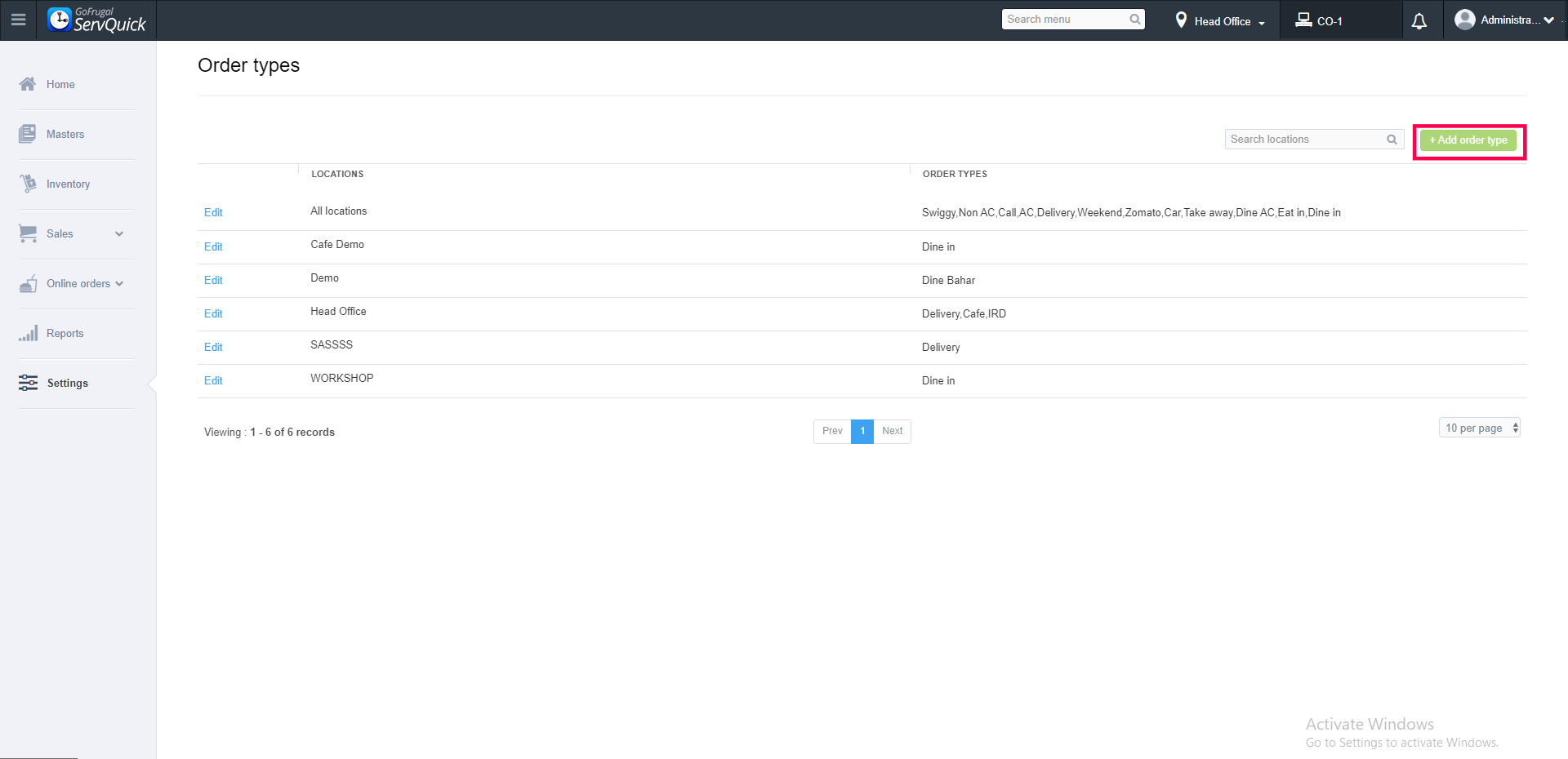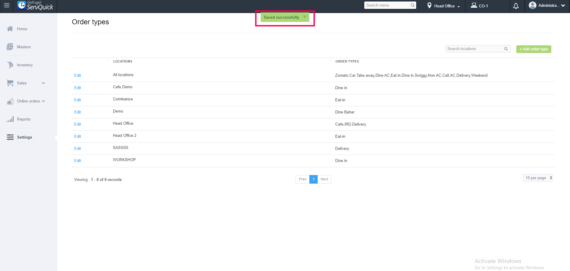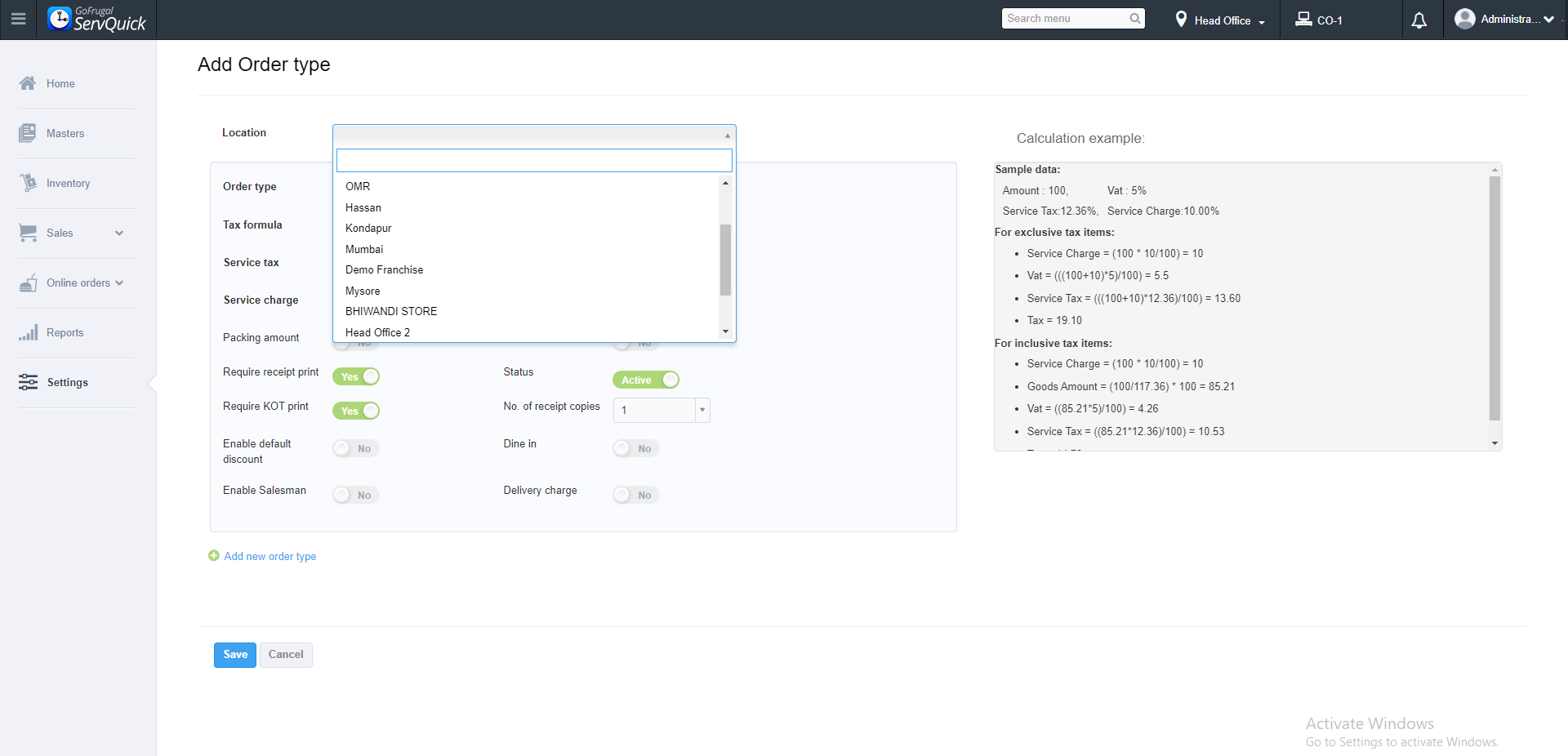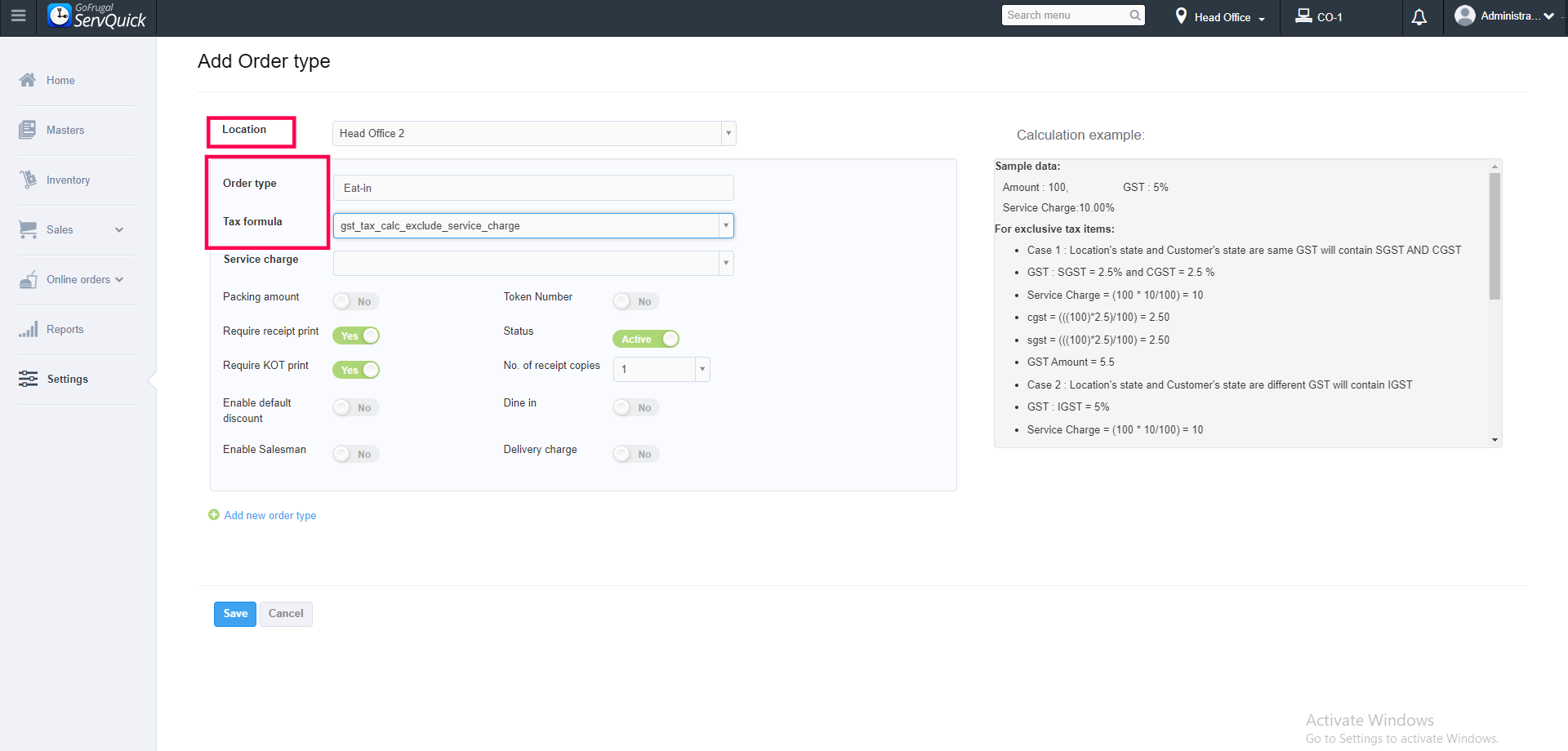 Enter the Name of the Order Type. It can be, eat-in, dine-in, takeaway, etc.