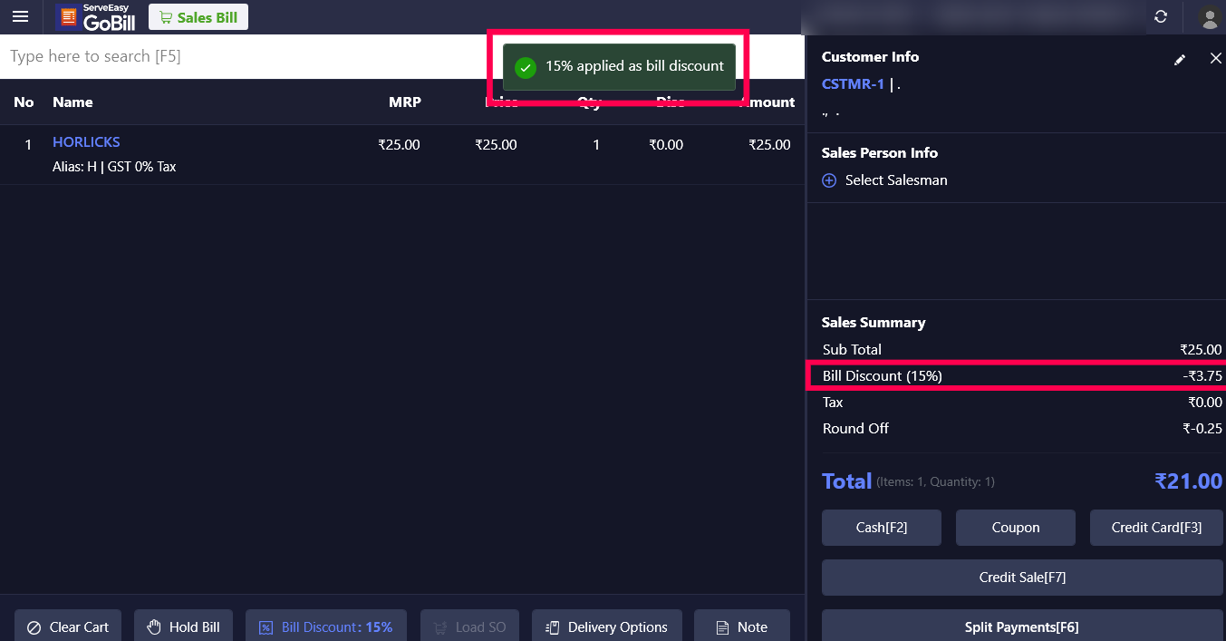 - If a bill discount is applied for the added customer, a pop-up can be seen on the top and you can check out the discounted bill amount in your cart as shown