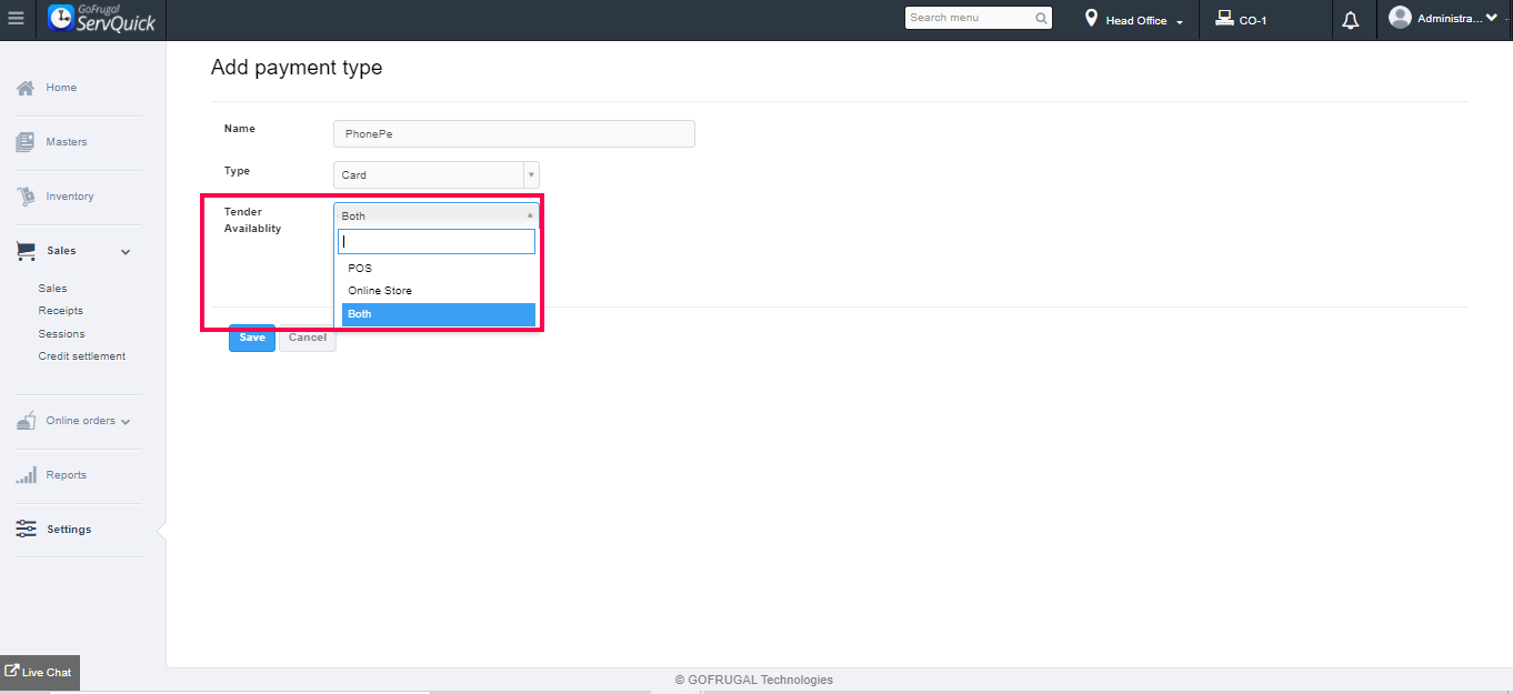 Enter the Tender availability. This feature allows you to choose if this payment type is applicable in POS/Online Store/Both.
