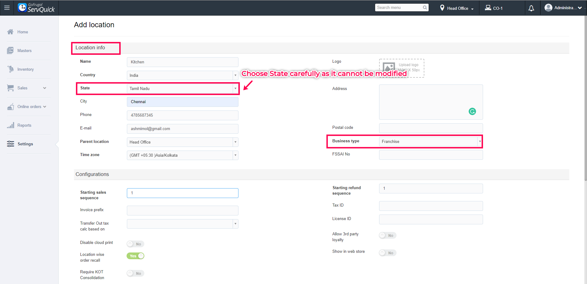 Step1: Enter the required details like Name, Country, State, City, Phone, Email, Parent Location, and Business Type