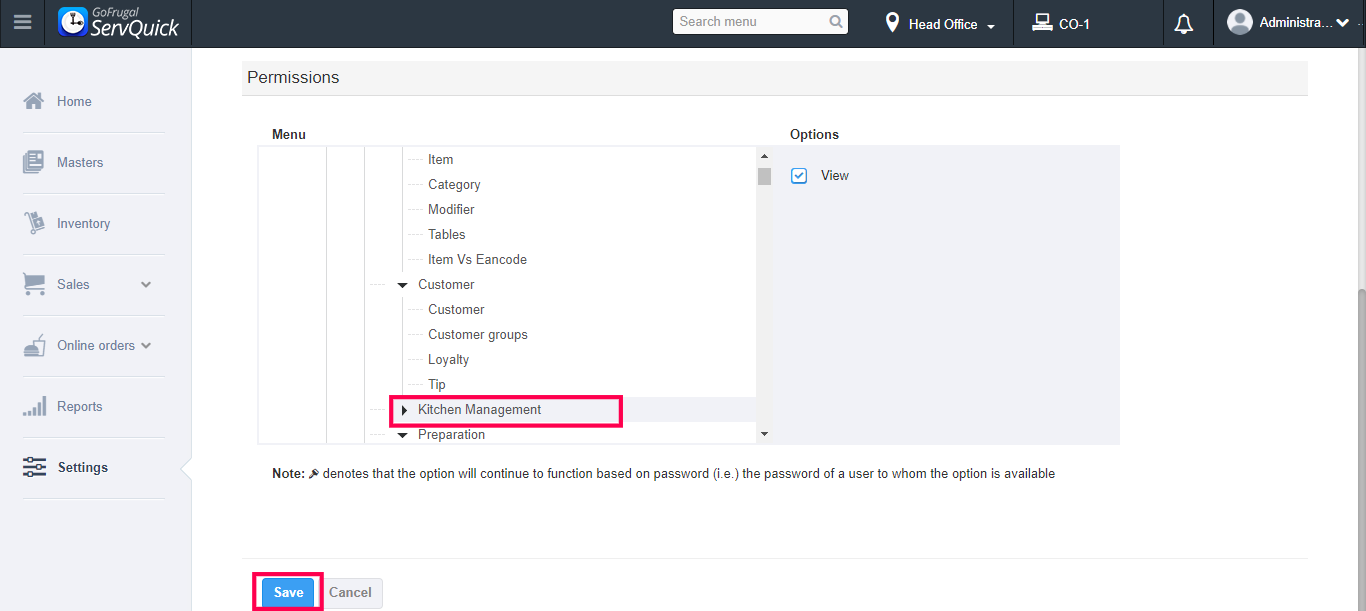 -->Under Permission, you can select the fields that the steward can view at any time. It is completely the owner's wish. Here I am selecting Kitchen Management permissions. So, the user can view all the details related to kitchen management.