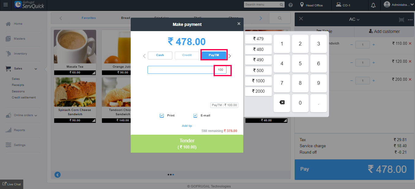 Similarly, select the different payment modes, enter their respective amounts for completing the transaction and click on Tender.