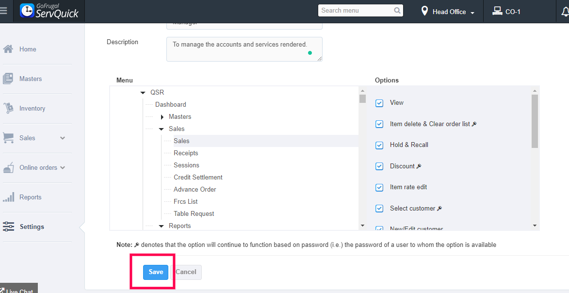 The Role is a feature in ServQuick that indicates the access and permissions that can be given to people working in different departments. Waiter, Cashier, Admins, Steward are some examples of roles in a restaurant. For example, a cashier is given access only to the screen and functionalities related to the accounts ad billing.