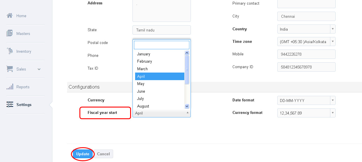 Financial Year Begin month could be set by going to Settings -> Company Info. Click on Update to save the changes made.