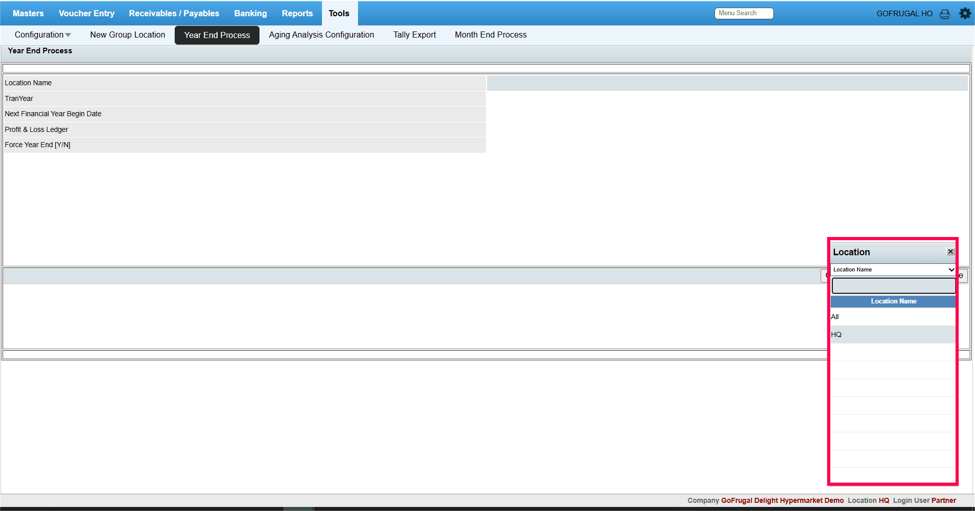 Step 3: You can select HQ location to execute year end process only in that particular outlet or else you can select "All" to execute the year end process for all the location including HQ which will carry forward the balances to the next financial year.
