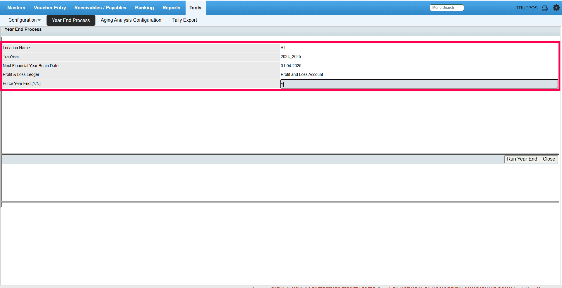 Step 7: Type 'Y' manually in the Force Year-End [Y/N] field. Click on Run Year-End.