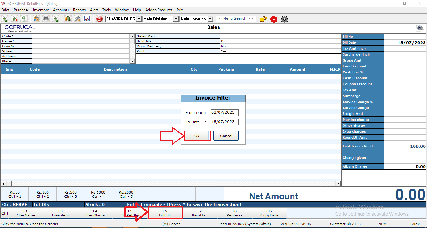 Step3: An 'Invoice Filter' will be shown where you will mention the date for which the bill has to be edited. Then click on 'Ok'.