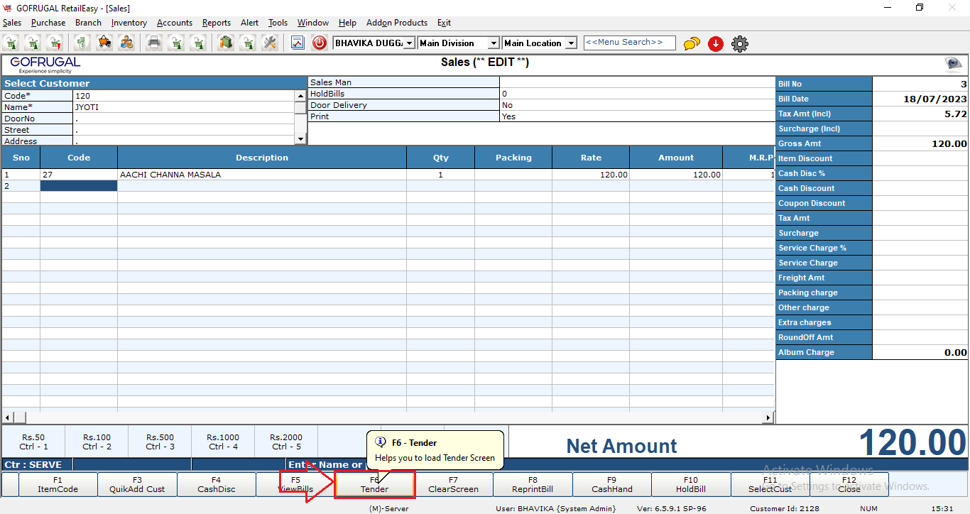 Step8: Simply click on 'Tender' to save the transaction.