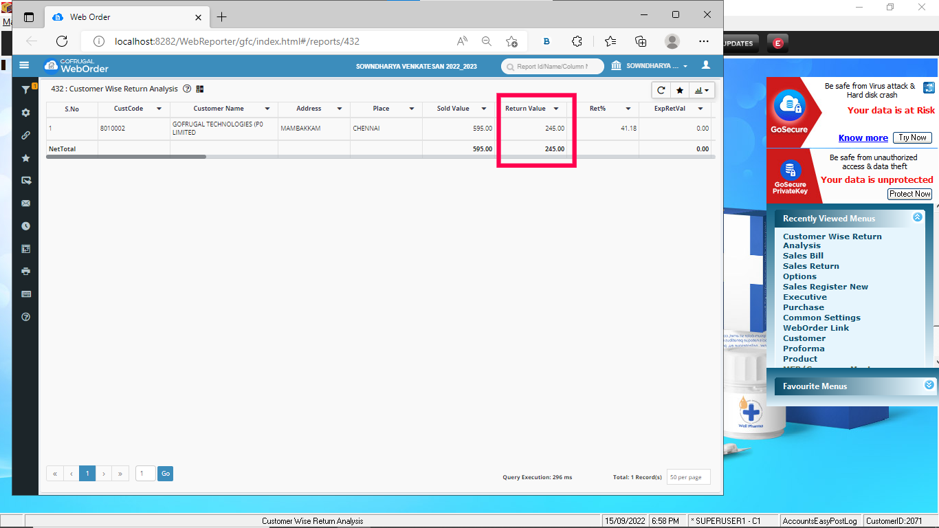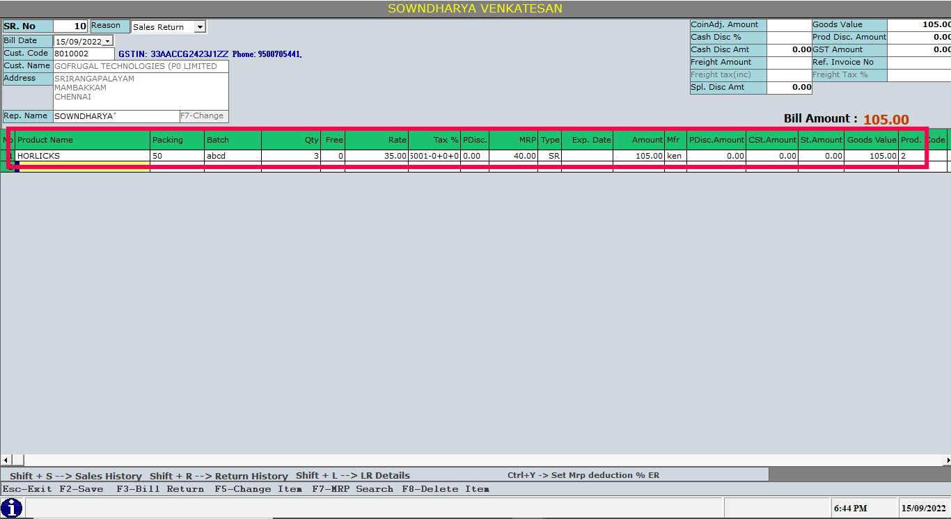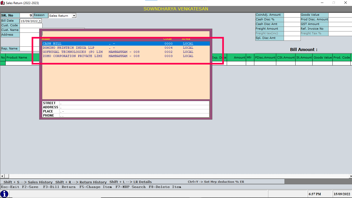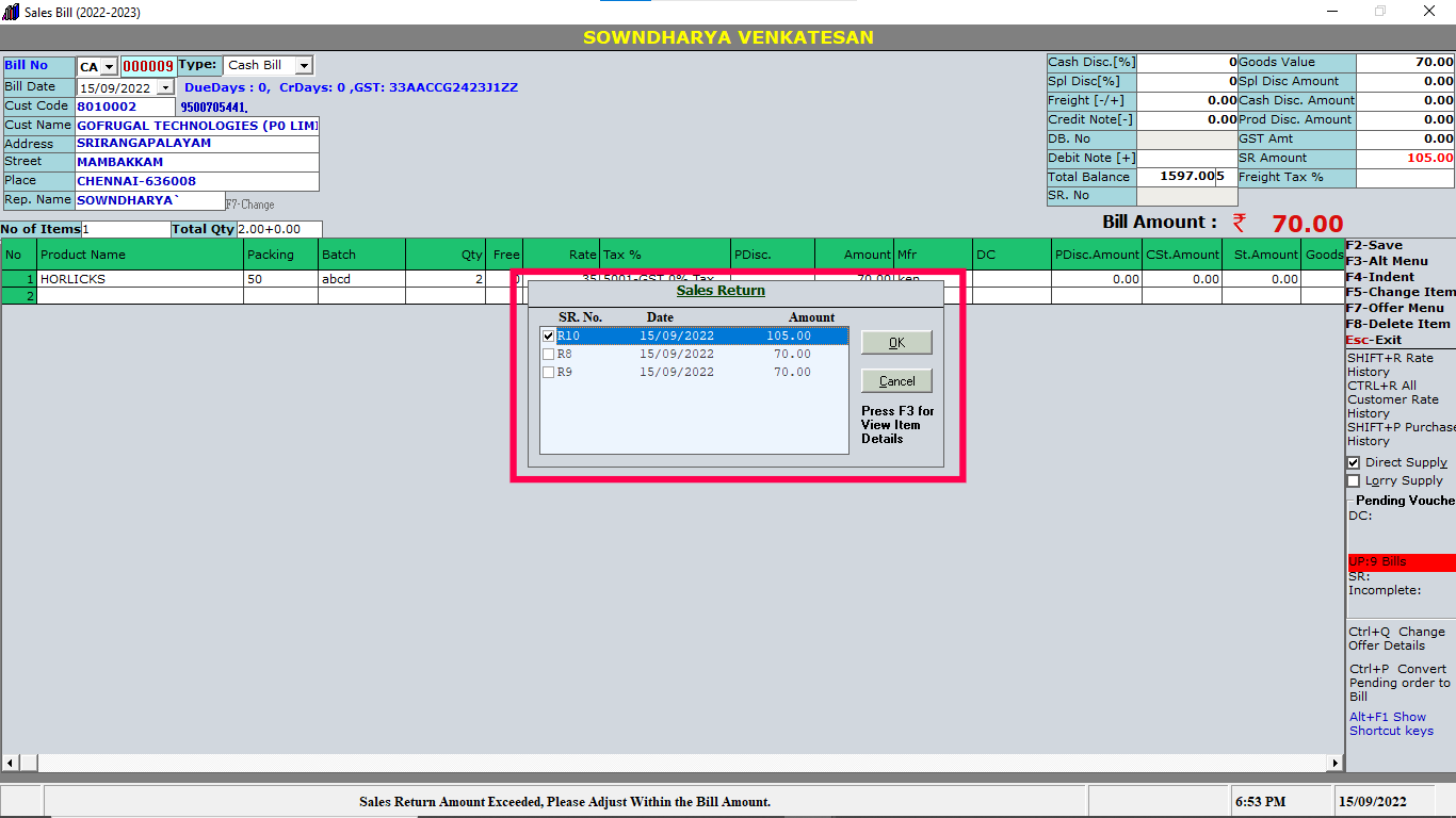 7. Enter the 'Product Name' and other fields like quantity, rate and press 'F2'. A pop up will appear containing 'Sales Return' details. Select the required and the amount will be adjusted by pressing 'Ok'