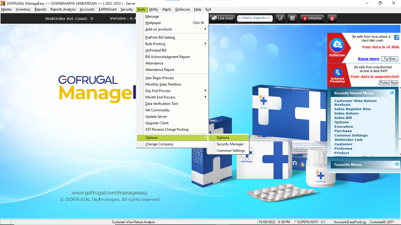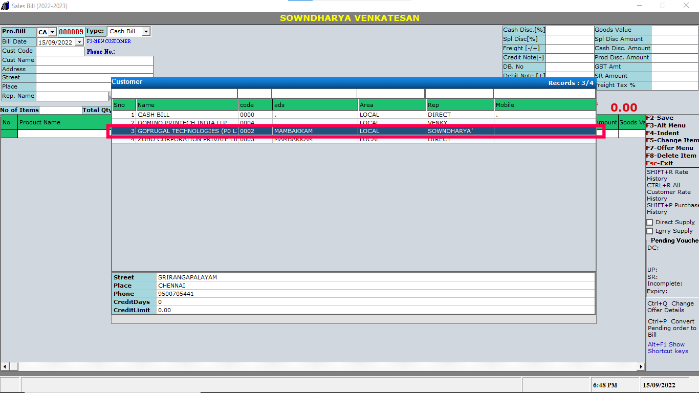 6. Go to 'Inventory' ---> 'Sales Bill' ---> enter the 'Customer Code' by clicking 'Enter' and choose the 'Customer'