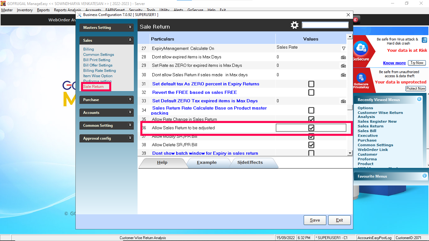 2. Under sales, click 'Sales Return'. enable the option "Allow Sales Return to be adjusted", by pressing the space bar and then 'Save' it