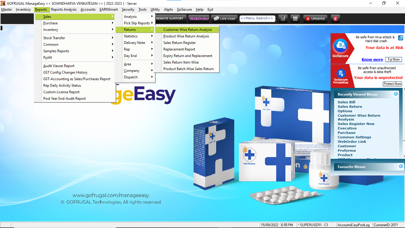 8. Go to 'Reports' ---> 'Sales' ---> 'Returns' ----> click on 'Customer/Product Wise Return Analysis'