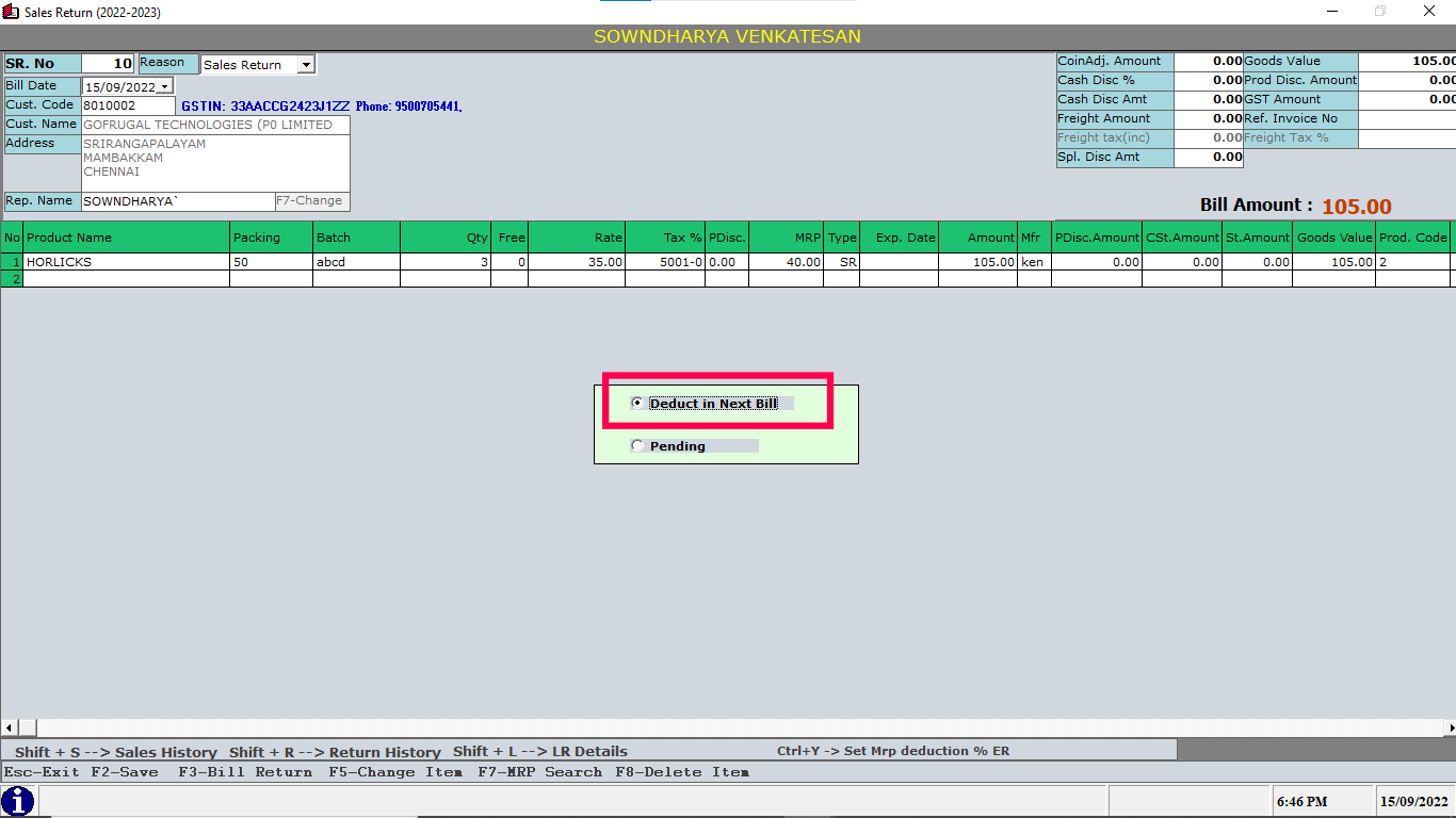 5. In 'Product Name' enter the product which you want to return and enter the quantity and then click on 'Deduct in next bill' and then 'Save' it