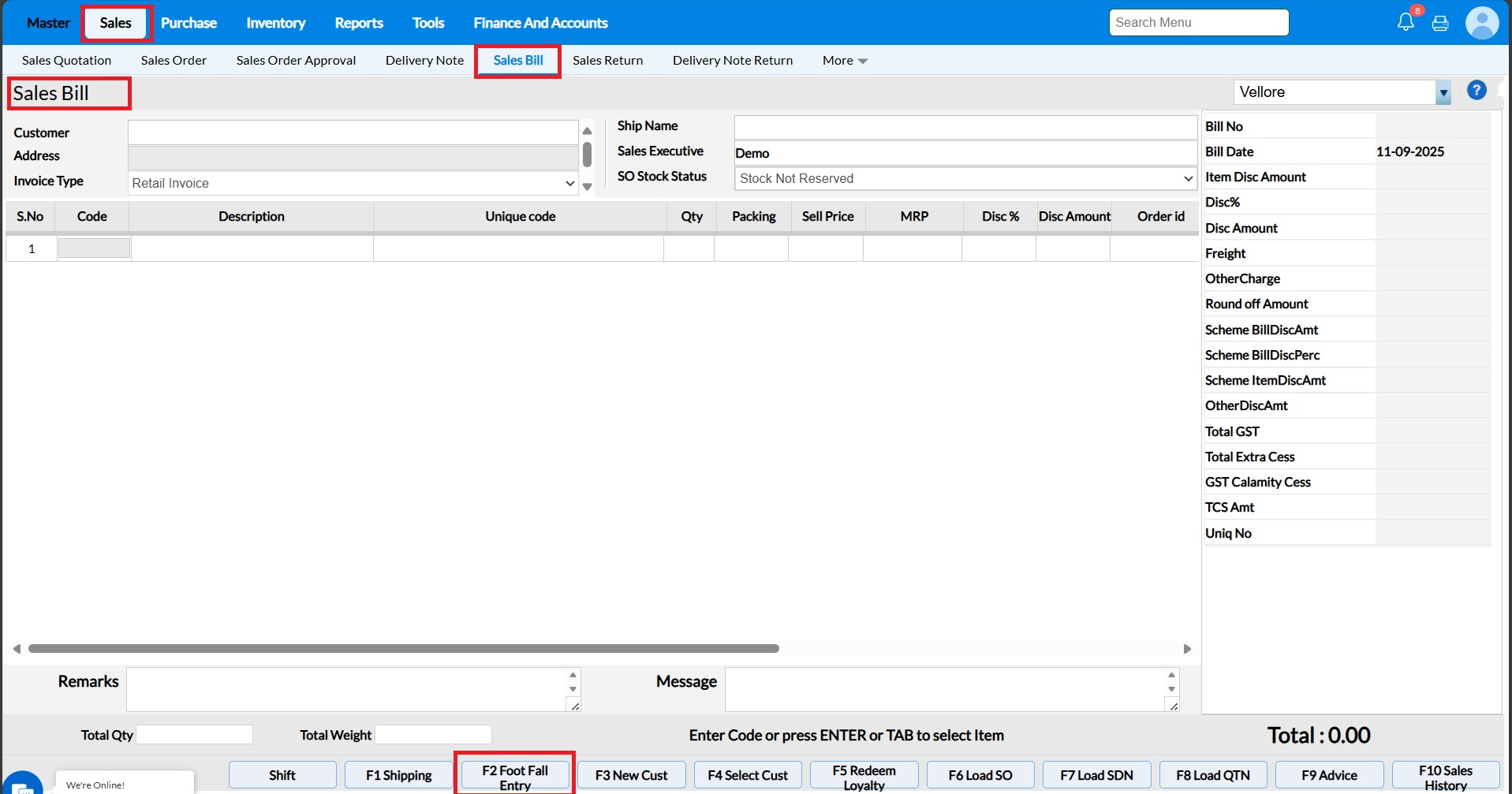 1: Go to Sales->Sales bill->Press Shift+F2 to make a footfall entry