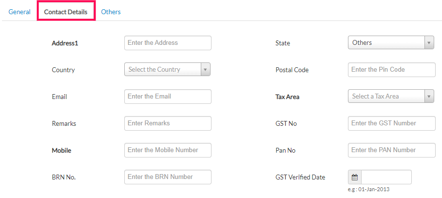 Address1, State, Country, Postal Code, Phone, Email, and Mobile: These details can be filled and used for telephonic contacts or shipments to your customer.