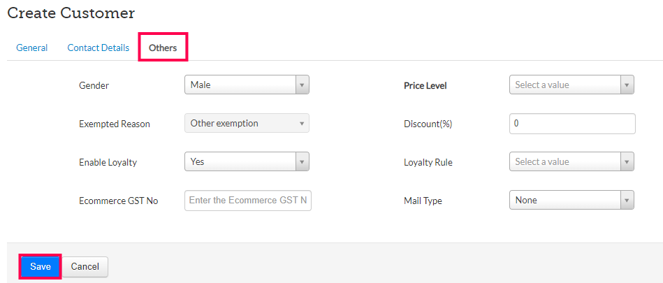 Status: Assign the Status as Active to use the customer for transactions. Assign the status as Inactive to delete or remove the customer.