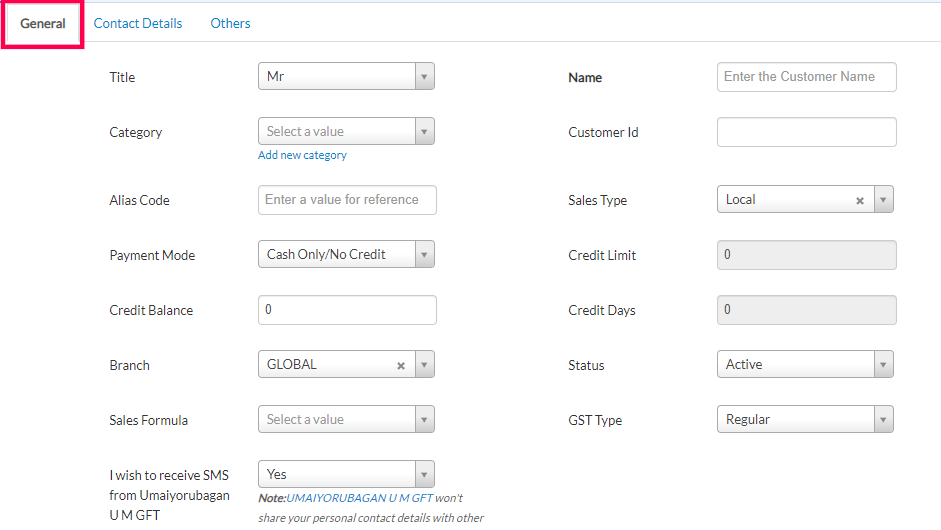 Step 4: In the Create Customer screen, enter the fields under the General section.