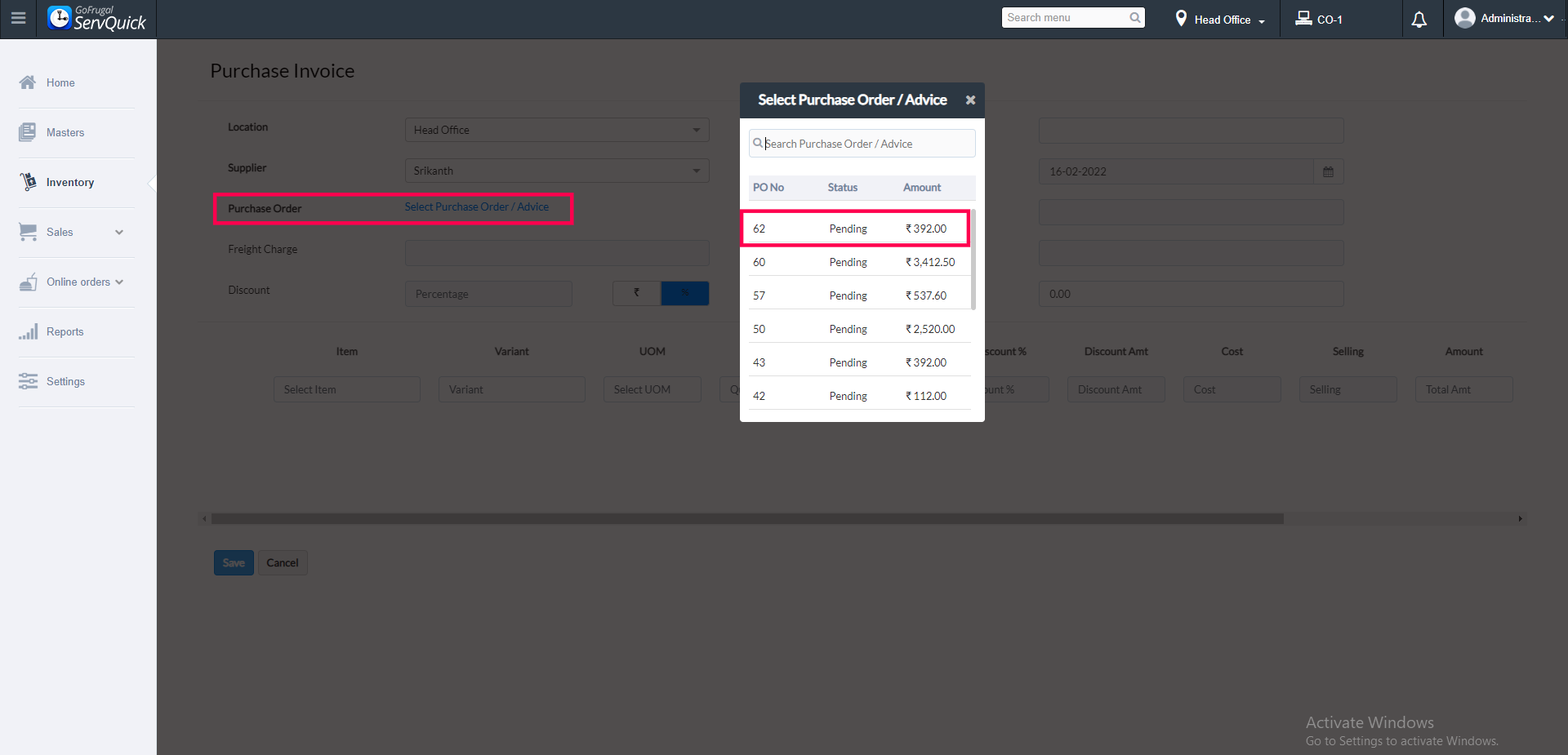 Steps to receive Purchase Invoice from Franchise outlet in ServQuick