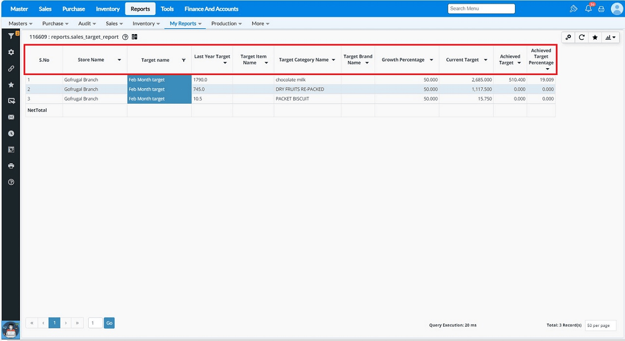 8.The Reports can be fetched based on the "Target Type" Category /Item/ Brand.Now you can verify the Sales Target details in Reports.