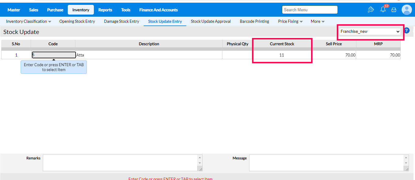 2. Goto >> Inventory >> Stock Update Entry. The Stock Update Entry screen appears and