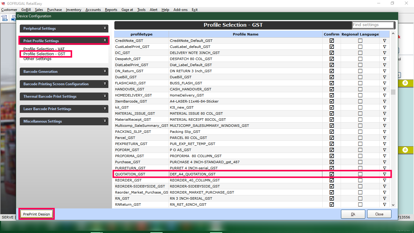 Step 2: Click on Print Profile Settings > Profile Selection - GST > Quotation_GST.