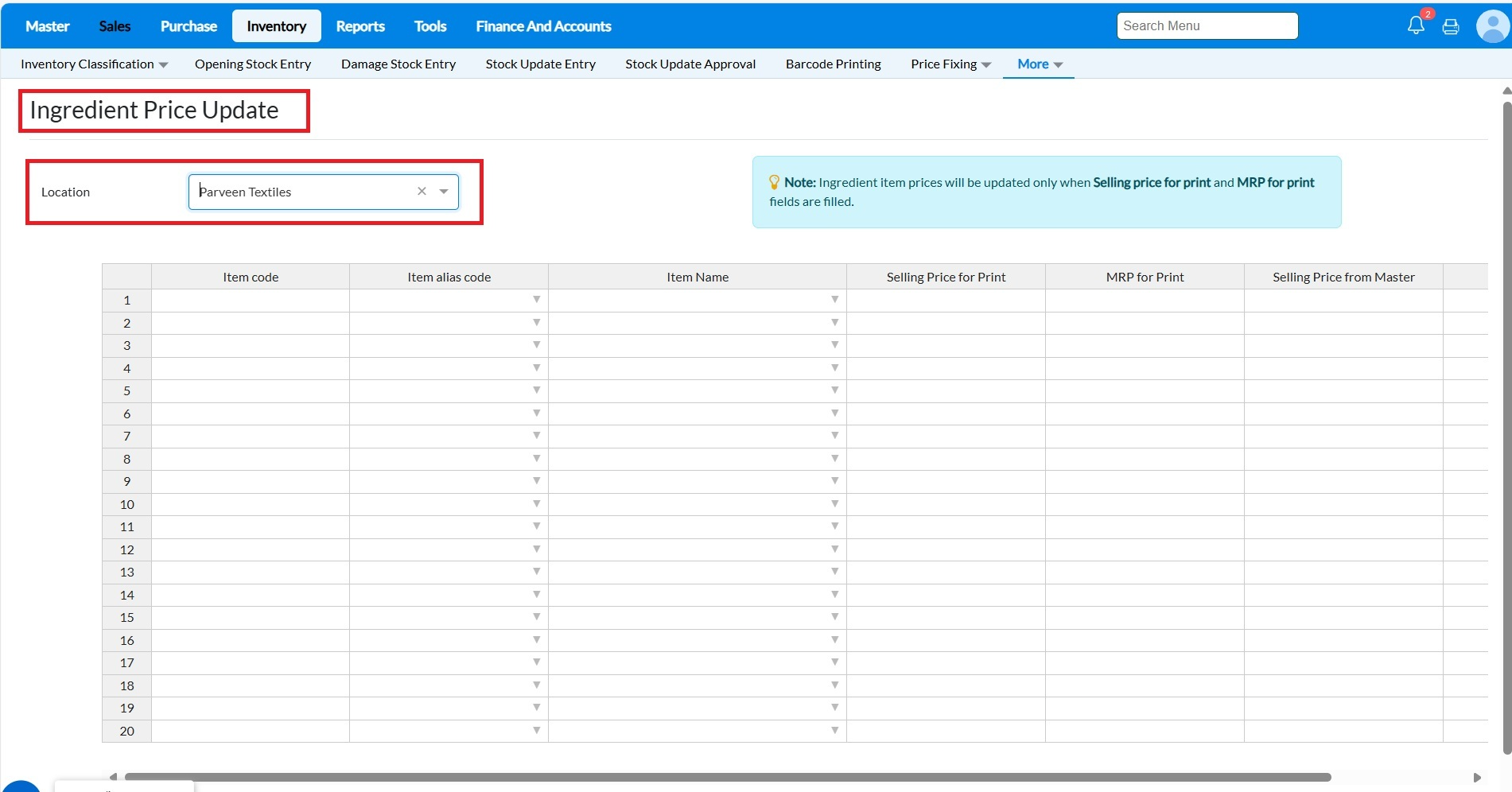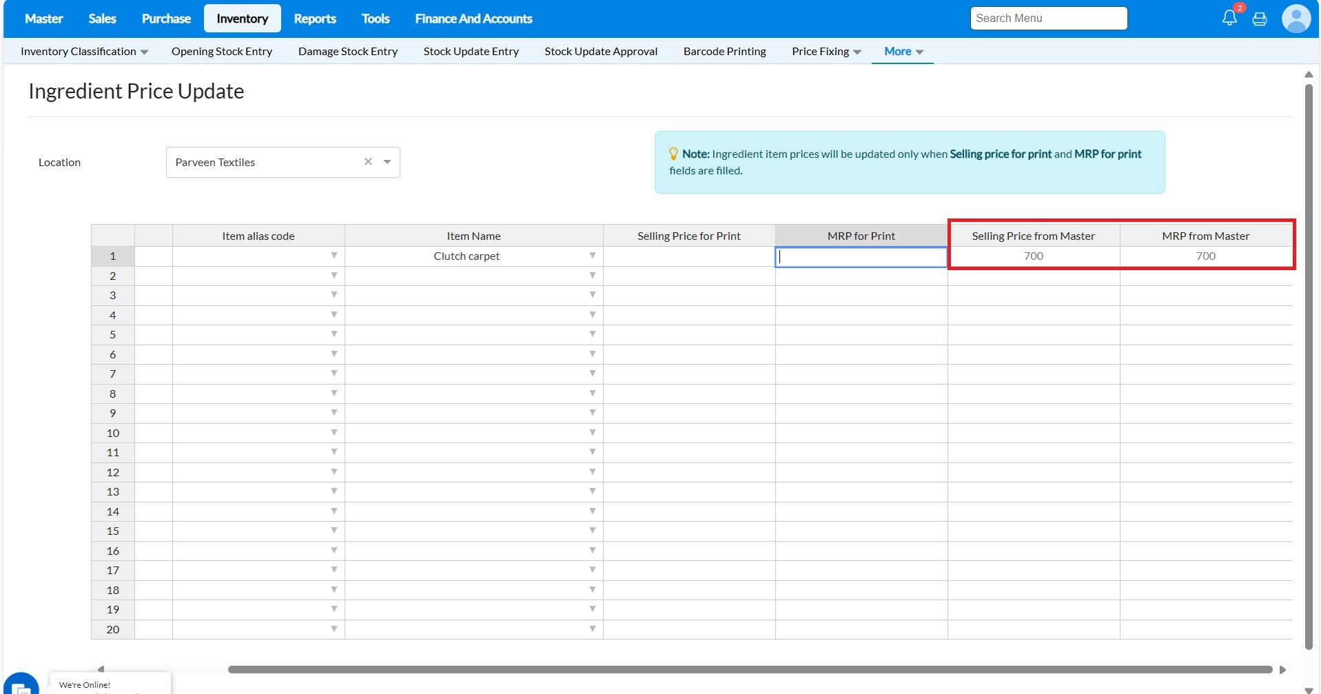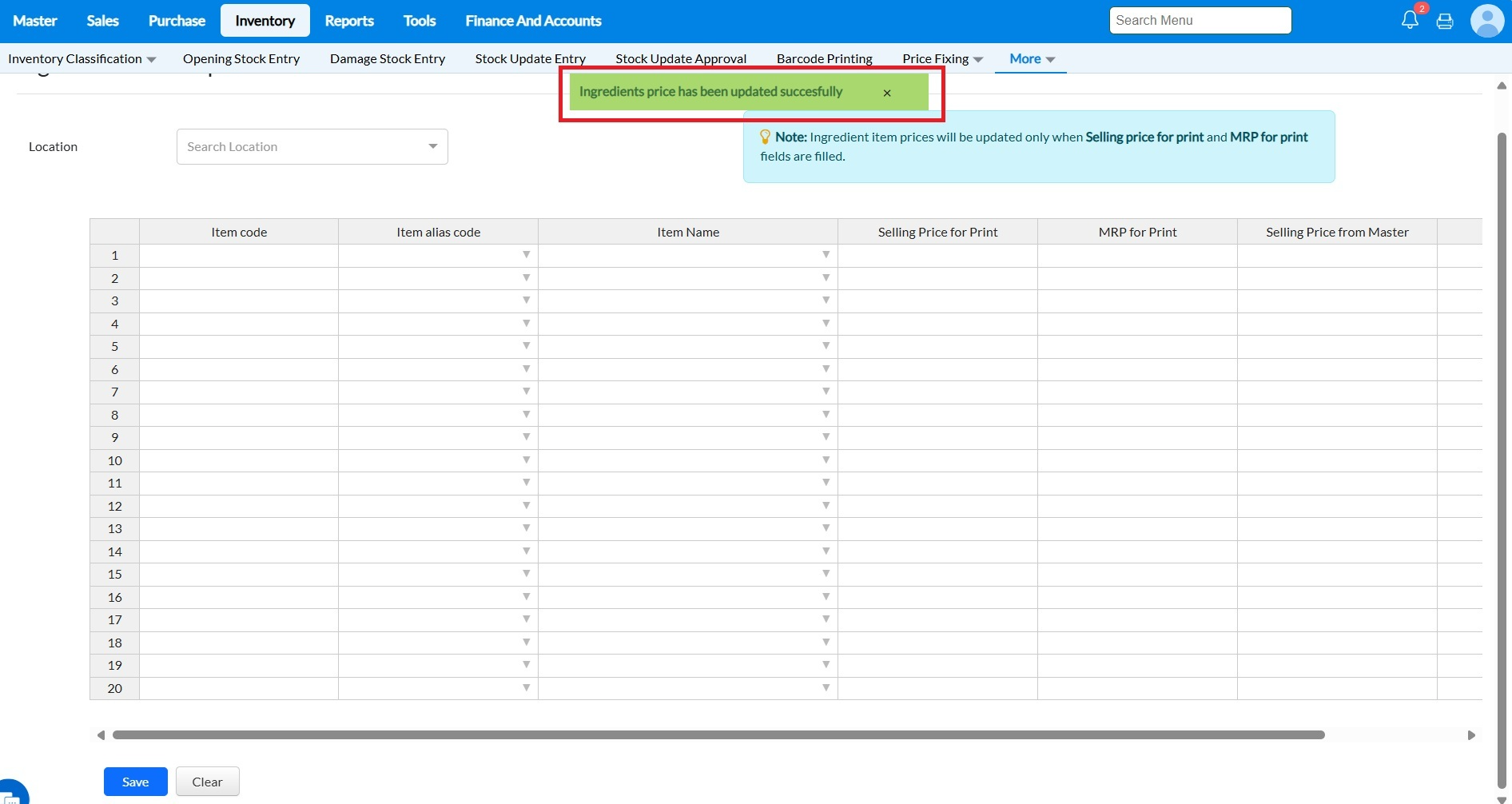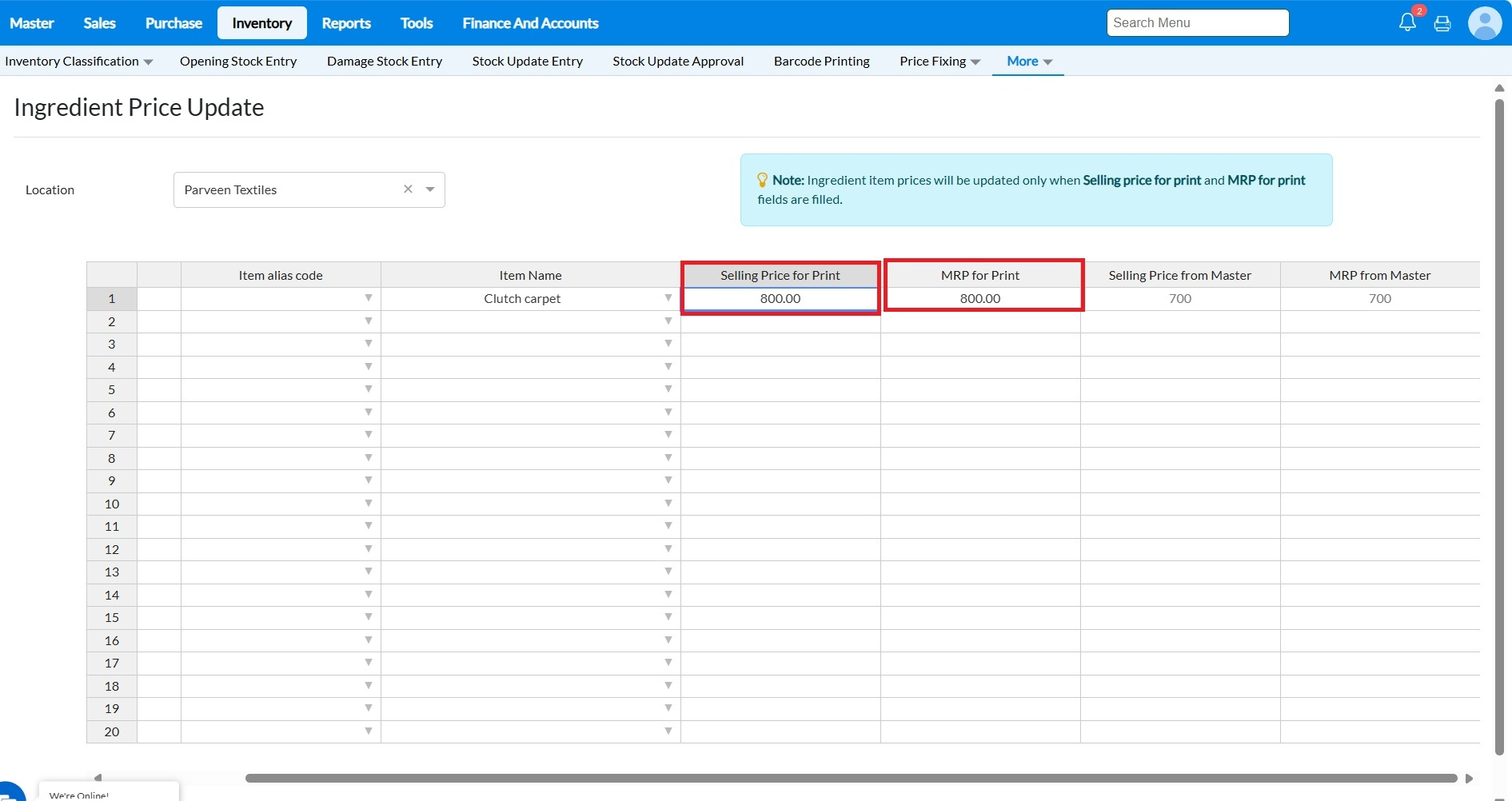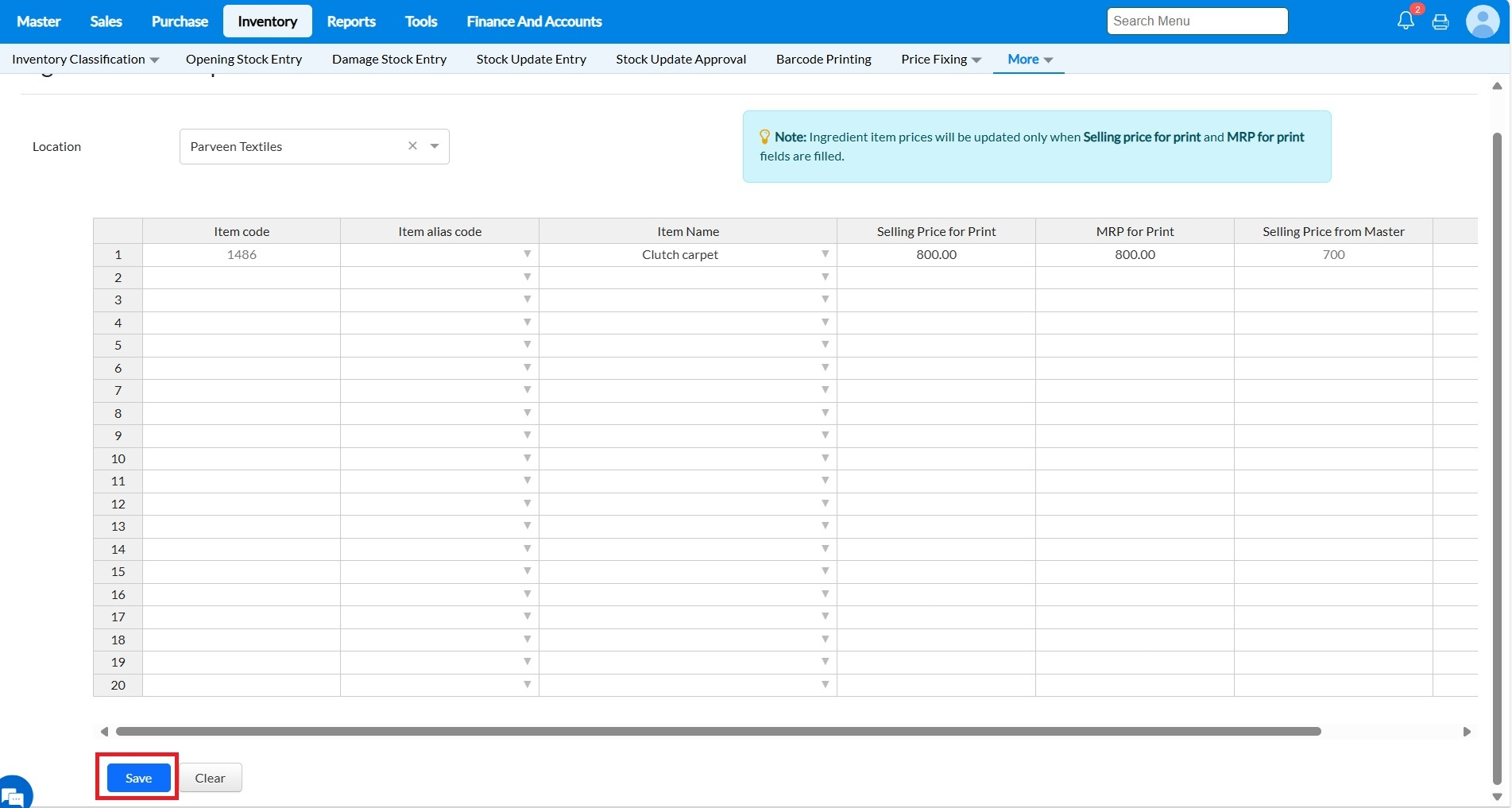 Note :- If the selling price or MRP for print is not given, then the price of that row item alone will not be saved.