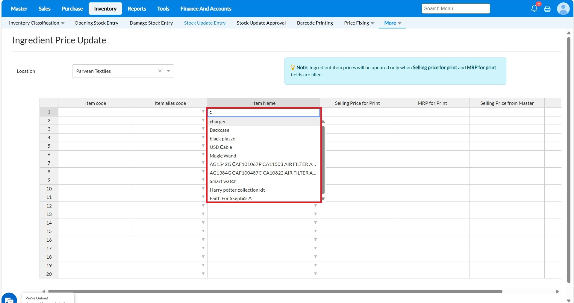 The Ingredient Price Update feature allows you to update the selling price and MRP of ingredient items used in Kit items within the Inventory module of TruePOS.