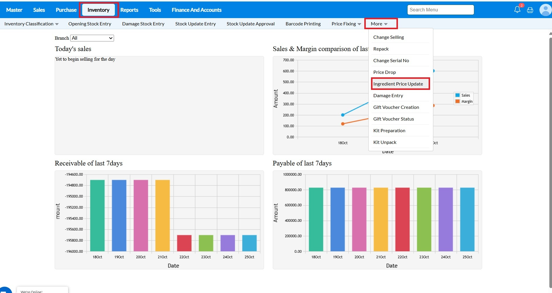 2.Navigate Dashboard to " Inventory" >> More >> Select "Ingredient Price update" option.