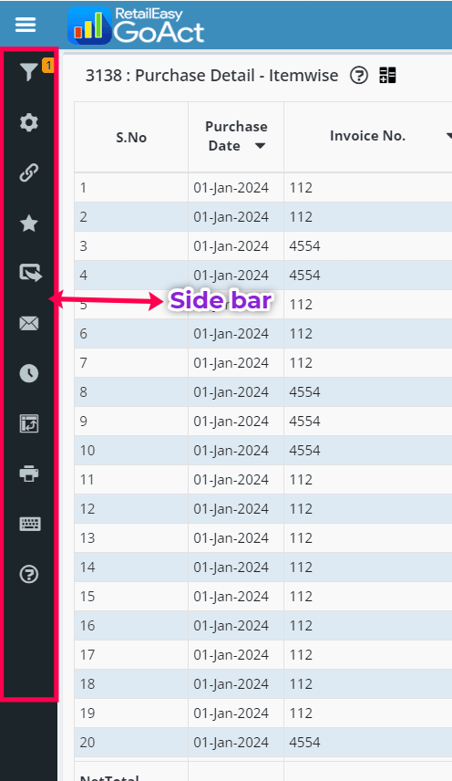 Positioned on the far left, the sidebar offers navigation and additional tools for report management, including:
