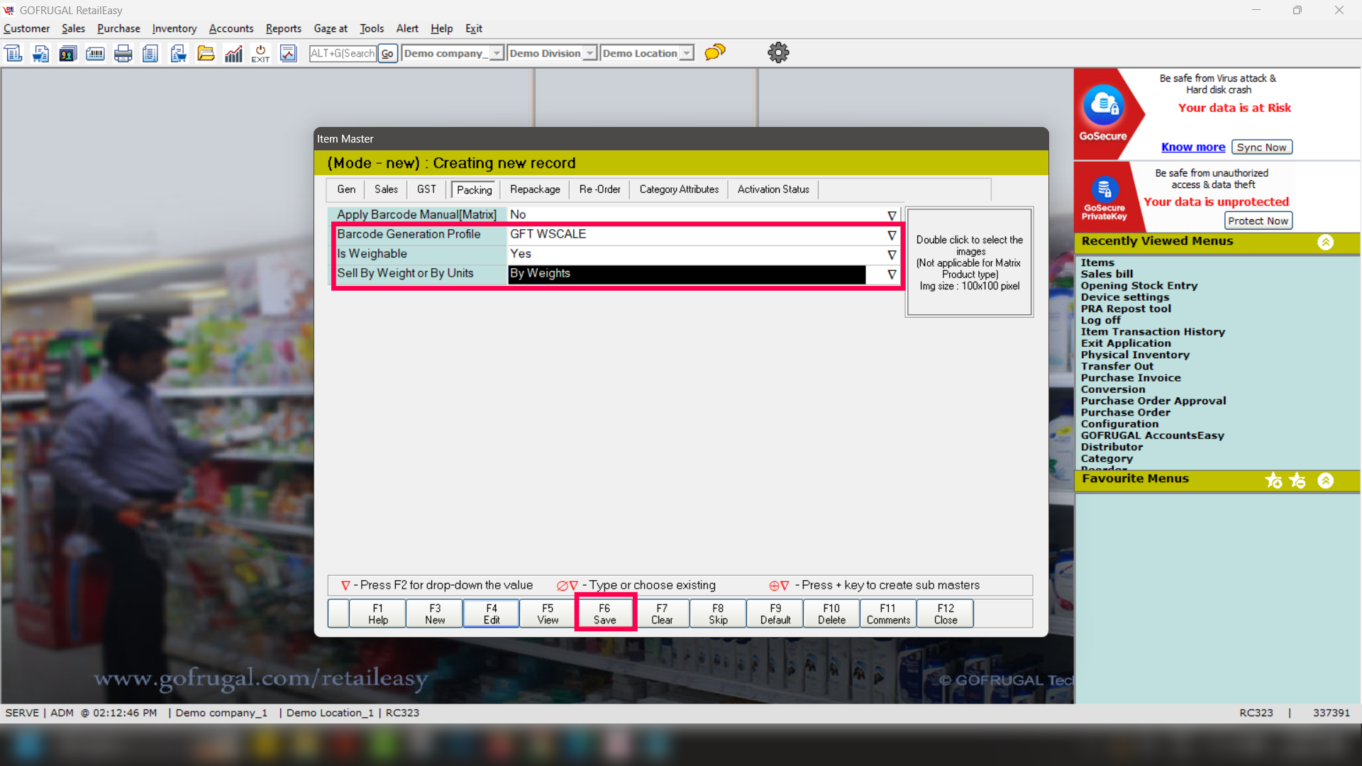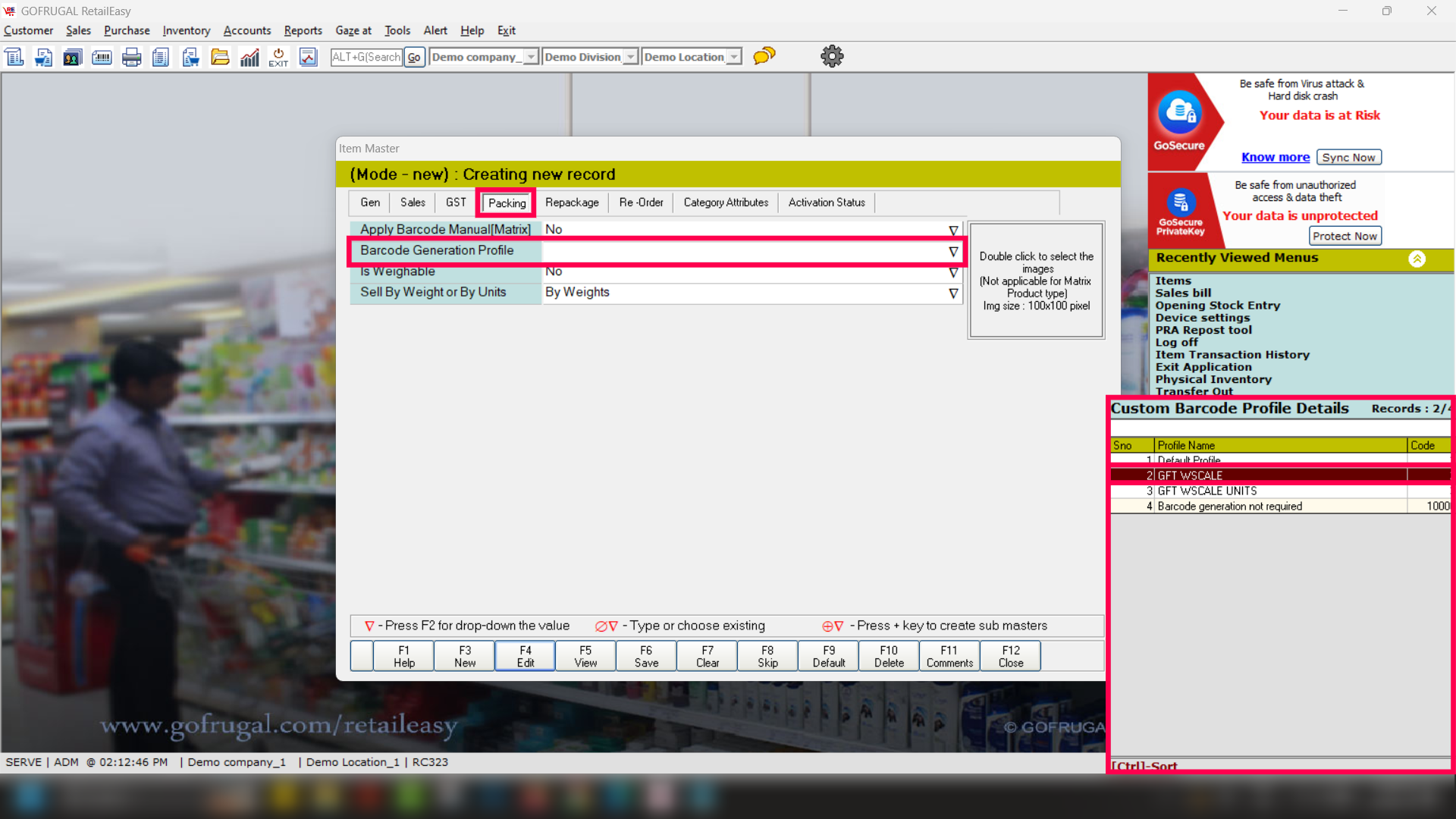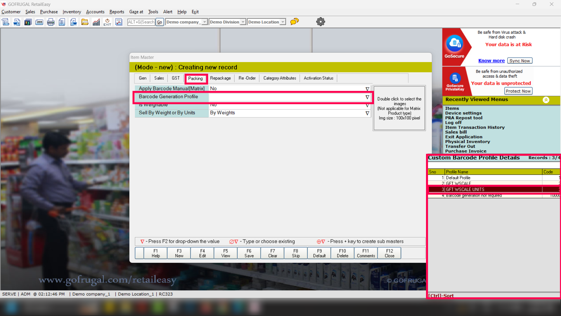 Step 4: Click on the Packing Tab and then click on Barcode Generation Profile and press F2 to load the Custom Barcode Profile Details LOV.