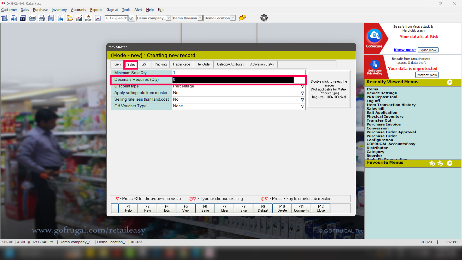 Step 3: Click on Sales Tab and put the Minimum Sales Qty as 0 & Decimal Required (Qty) as 3.