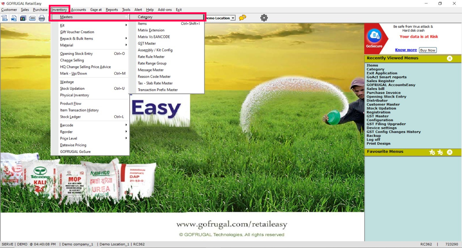 Step 2: Category Master screen will appear. Fill in with details for Category Name. Click Save.