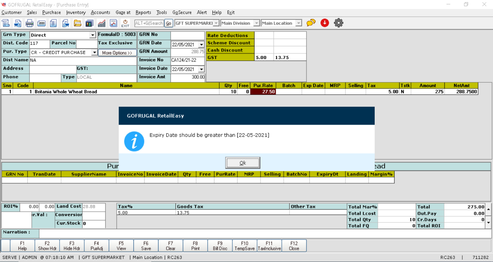 In case the calculated expiry date is less than the current system date then application will block such entry by showing the below message.