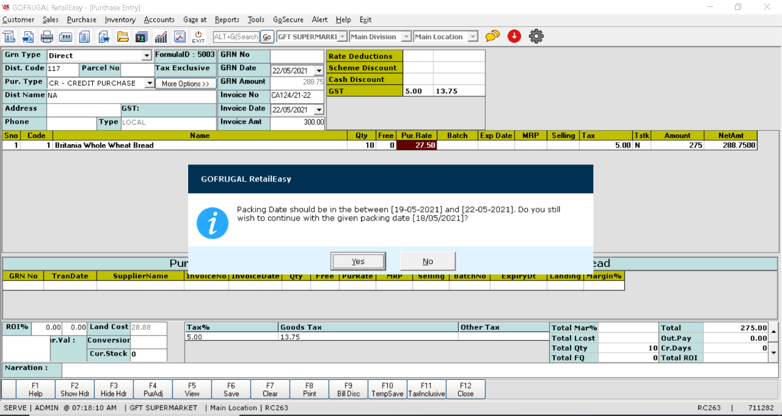 In order to make inward with packing date less than the applicable range, “Ask confirmation to allow calculated expiry date less than minimum shelf life” configuration has to be enabled as mentioned in step 1. This is useful if the retailer wants to intentionally make inward even though its calculated expiry date would not meet minimum shelf life condition. In this case, the application will ask one more confirmation message as shown below.