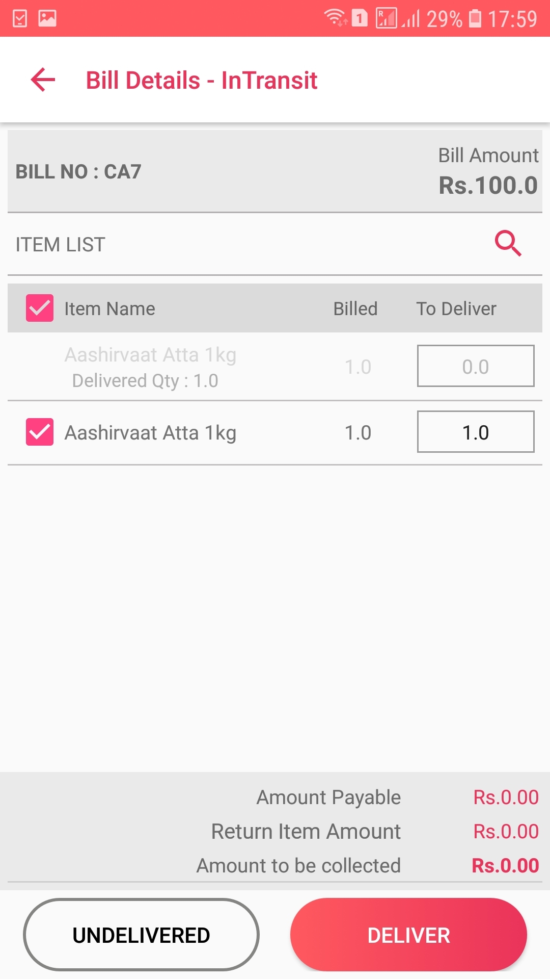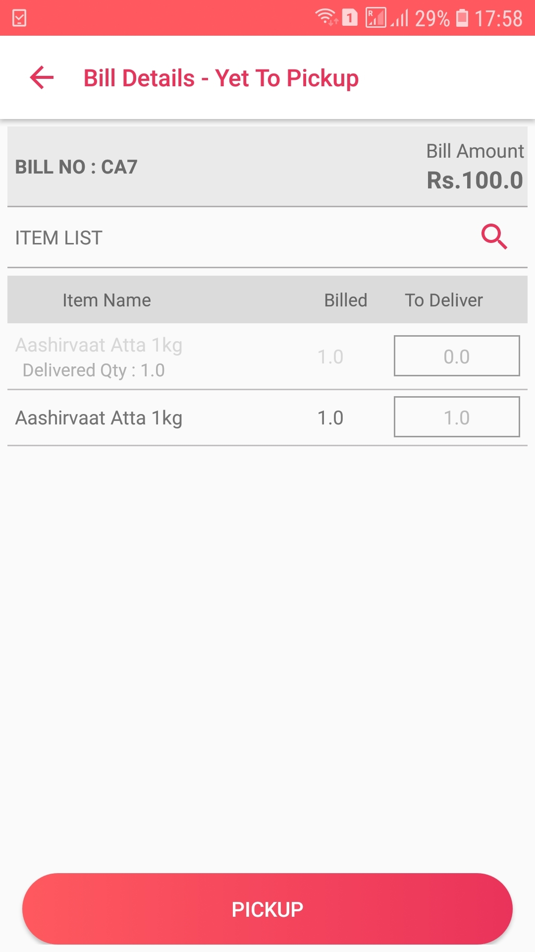 6. Open the yet to pick-up menu to pick the items. Since one item is already taken by the customer, it will display as "delivered" in the list and the delivery boy has to pick up only one packet of Ashirvaat atta