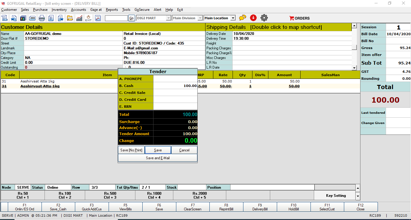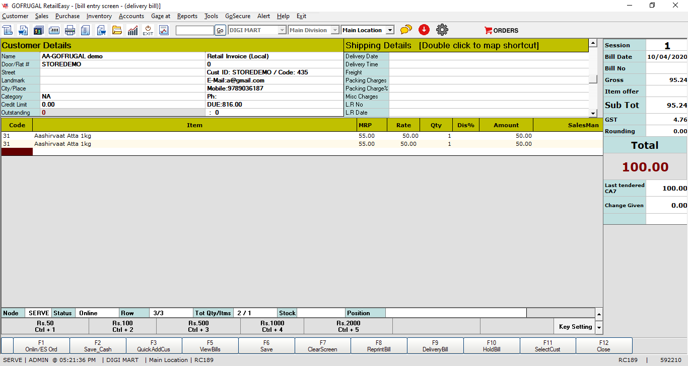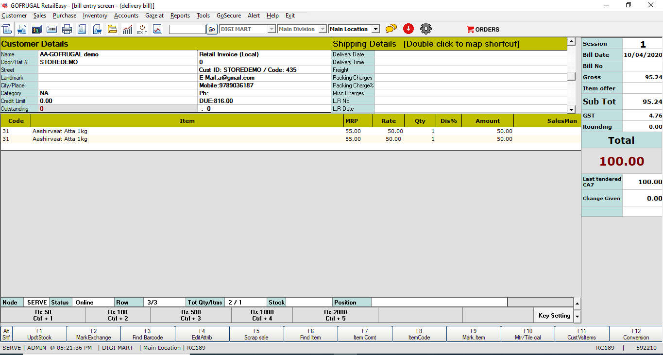 1. Open the sales bill screen, create a delivery bill and select the customer and mention the details of delivery boy and the delivery time in the shipping details and load the products.