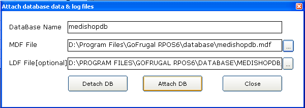 LDF File, you can use the browse button to browse the log file of medishopdb from C:\Program Files\Microsoft SQL Server\DATA.