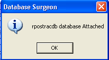 24. In the DBSurgeon screen, a message 'rpostracdb database attached' is displayed. Click OK.