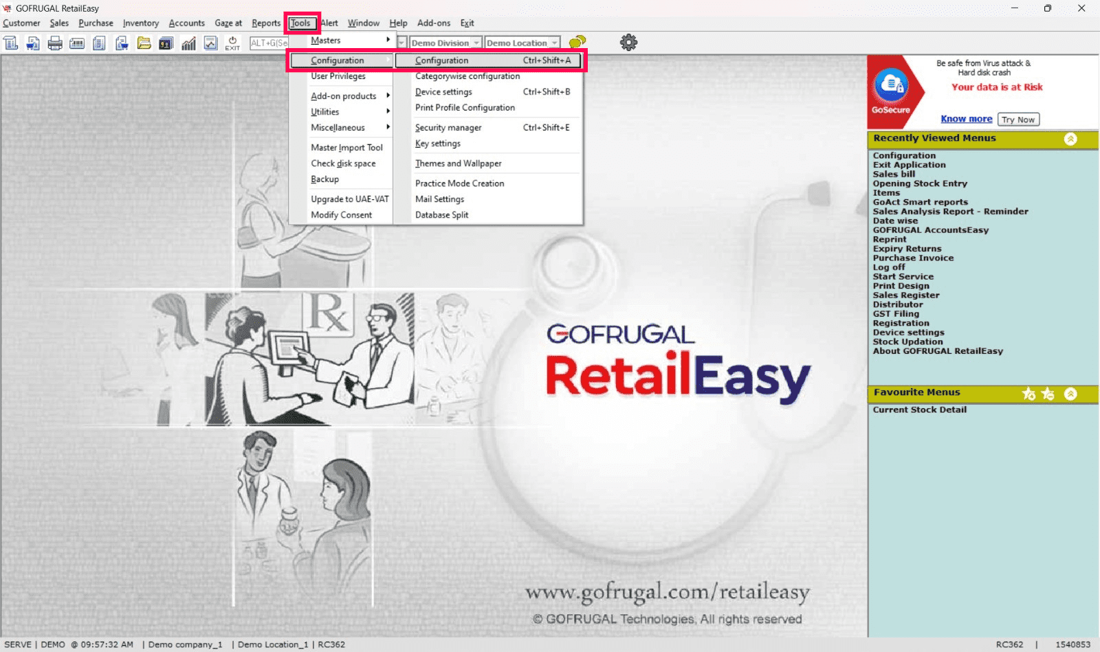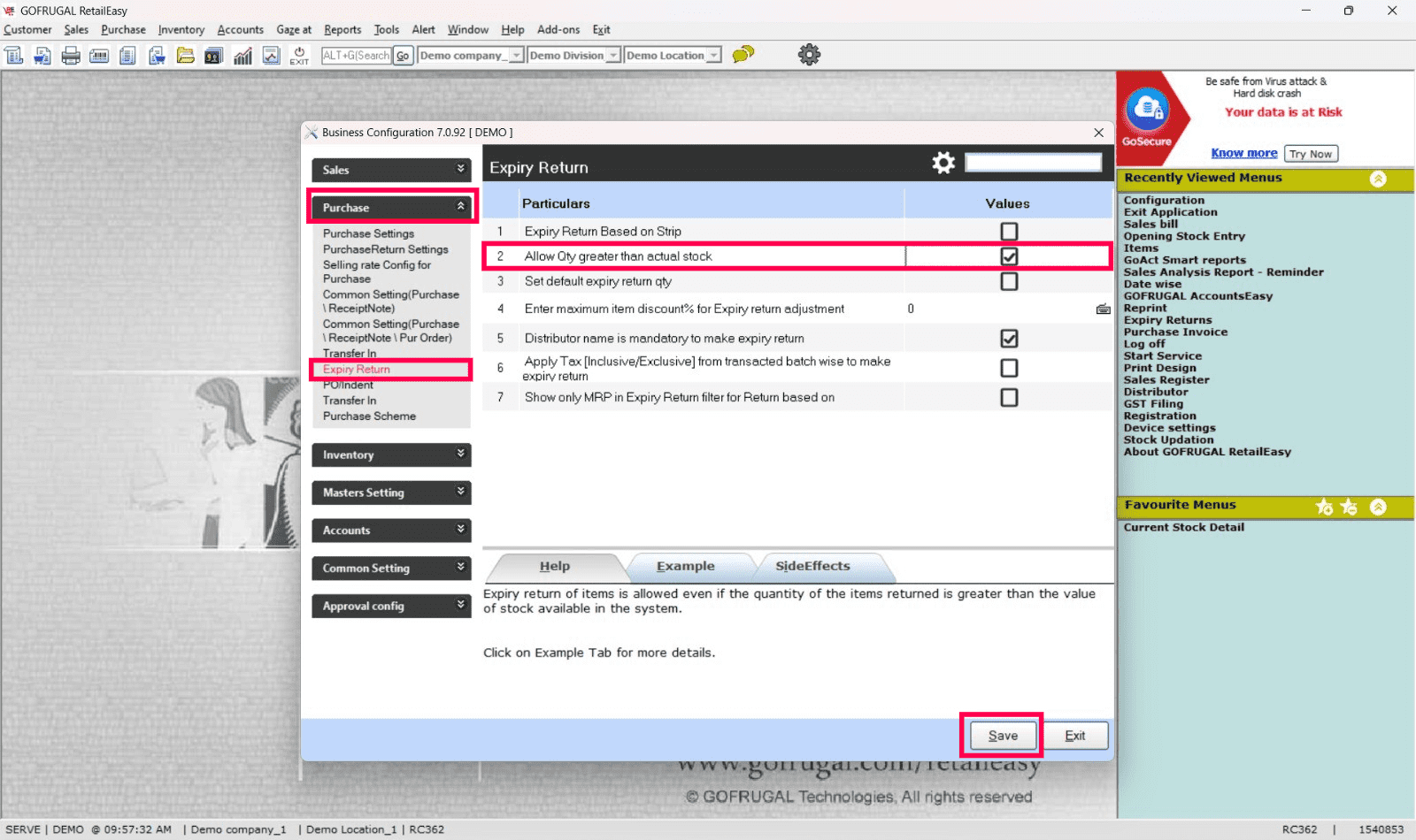 Step 2: Business Configuration screen will appear. Go to Purchase > Expiry Return - Allow Qty greater than actual stock (Enable the Checkbox) > Save.