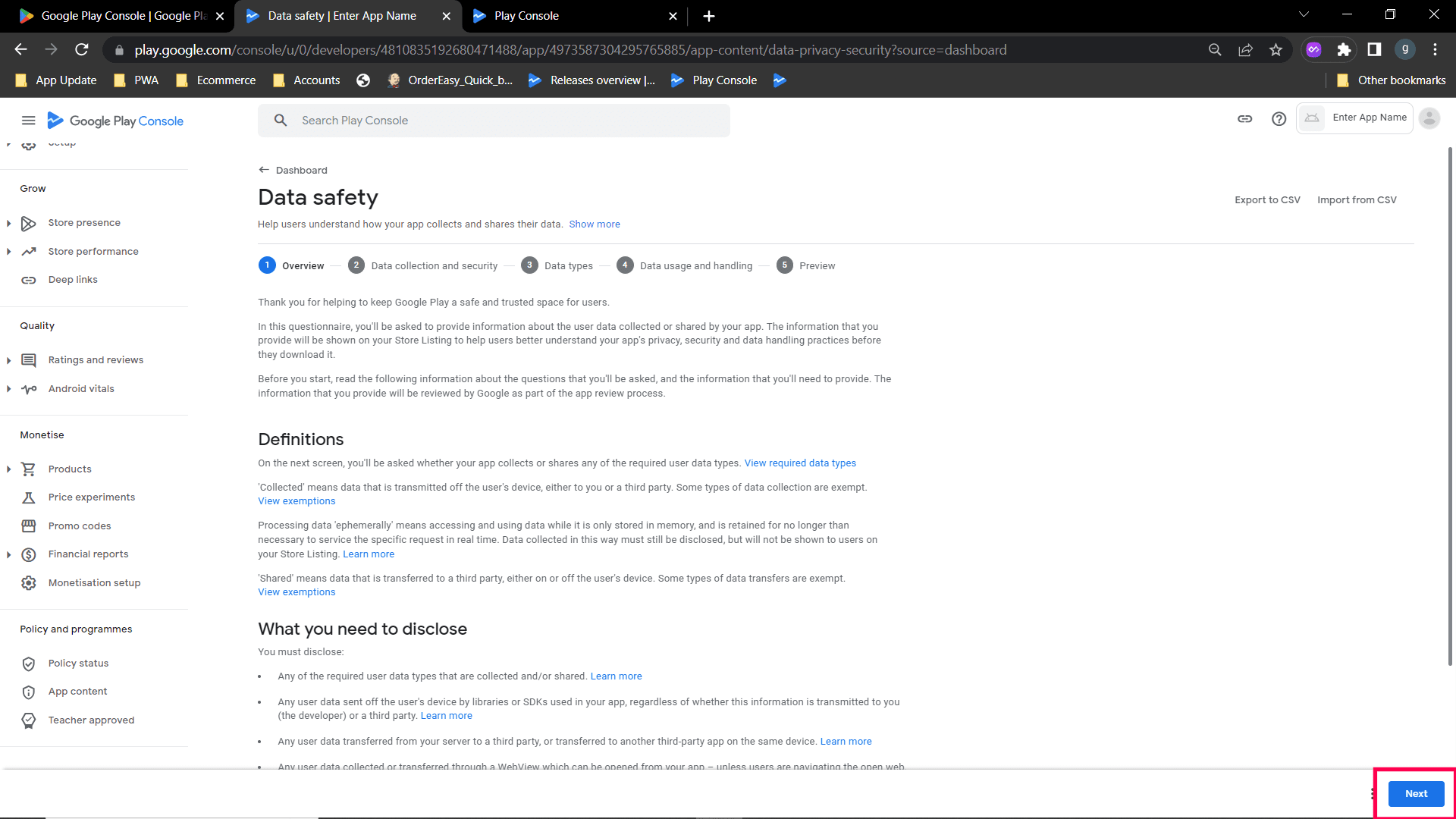 Step 2: Click next in the overview page & you will be redirected to the Data collection and security page