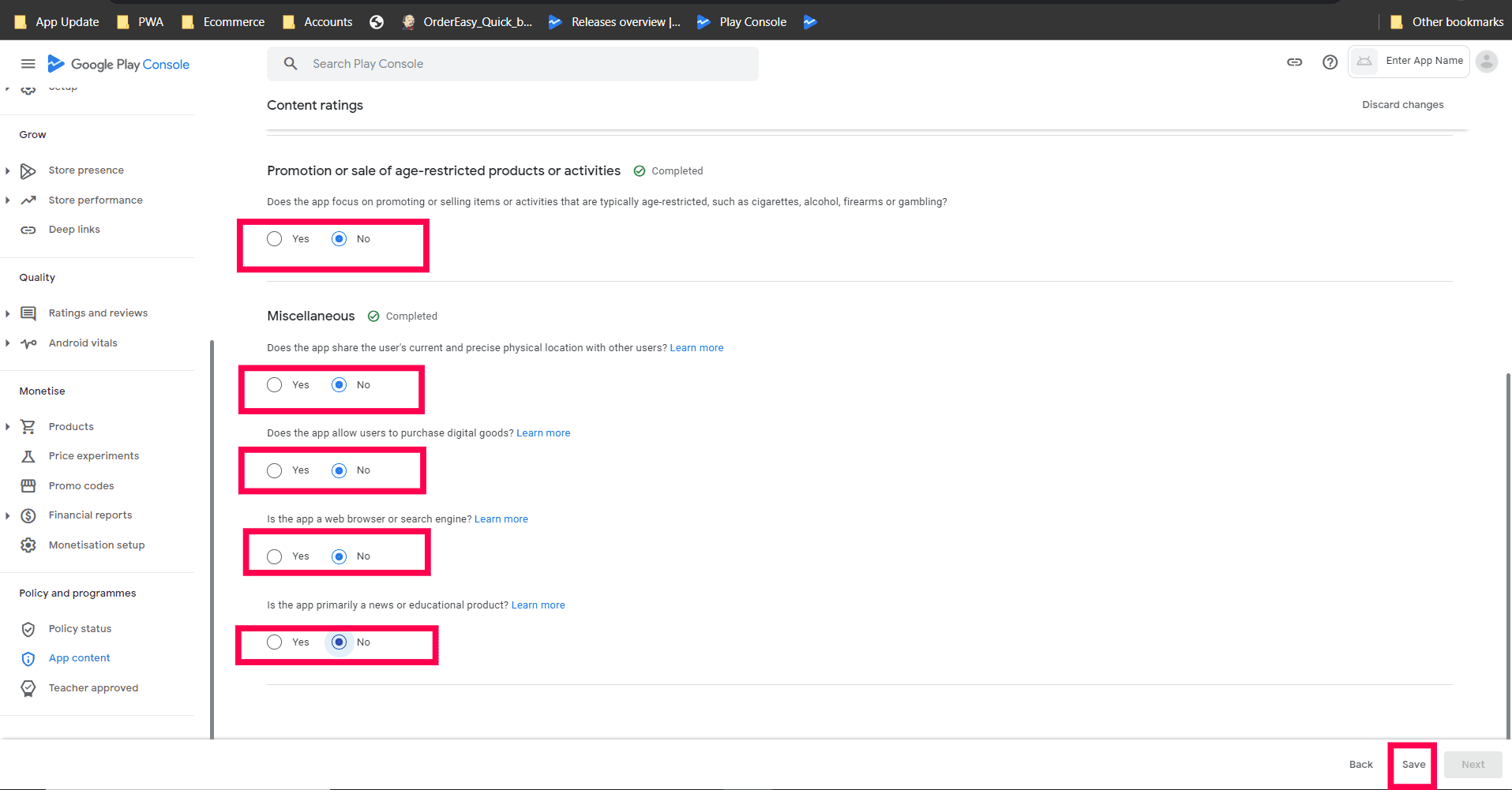 Step 8 : Select My app is not a publicly available COVID-19 contact tracing or status app & save. Go to Dashboard