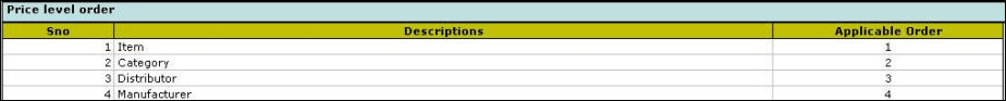 If category-wise is given the order '1', then the category- wise price level is applied to the item A. Similarly, it works for distributor- wise & manufacturer-wise price levels.