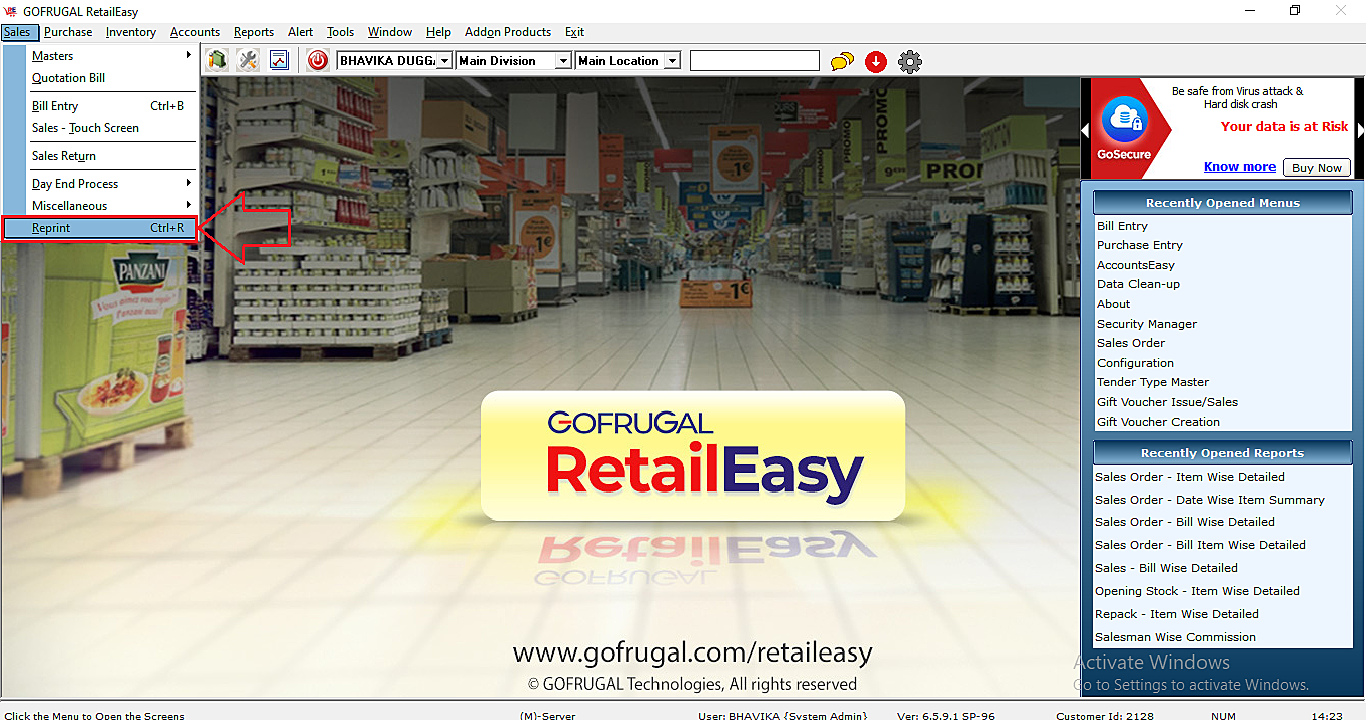 From Reprint Screen: By using this screen you can print single bill / multiple bills at one time and also the back dated bills